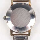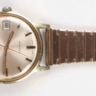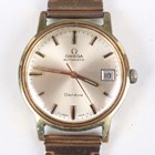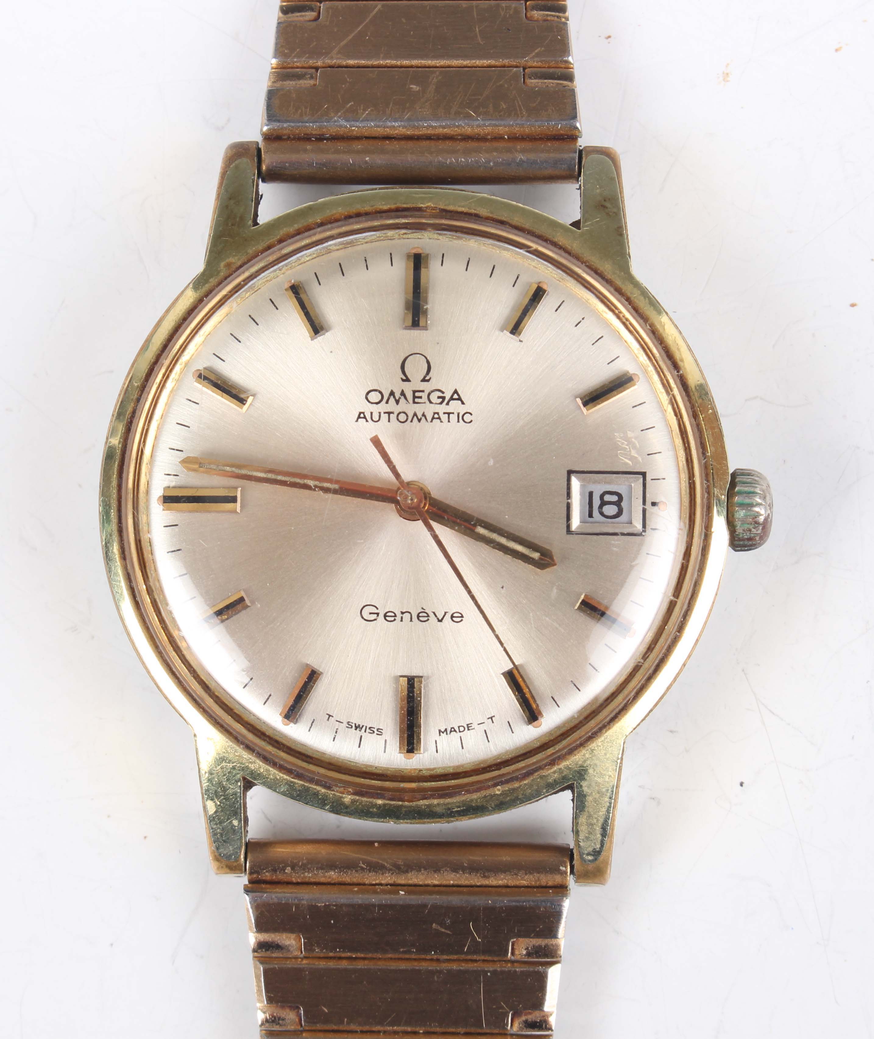 An Omega Automatic gilt metal fronted and steel backed circular cased gentleman's wristwatch with signed jewelled movement, the signed silvered dial with baton hour markers and date aperture, case diameter 3.4cm, on a gilt metal bracelet.