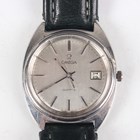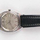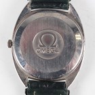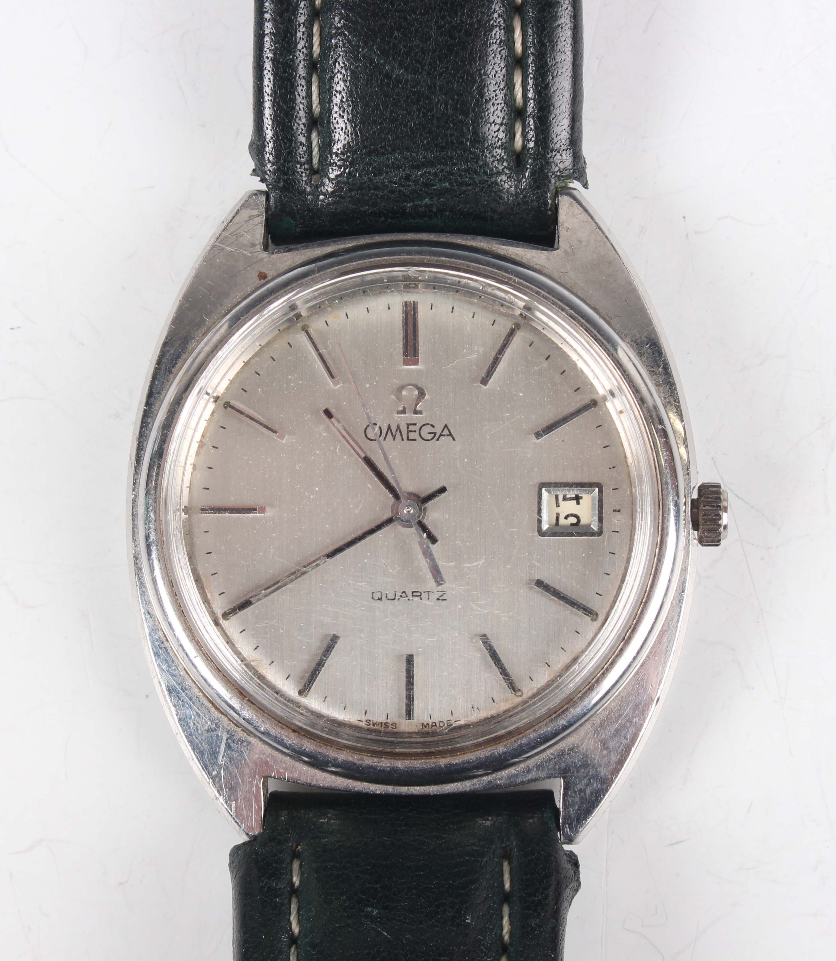 An Omega Quartz stainless steel cased gentleman's wristwatch, the signed silvered dial with baton hour markers and date aperture, case width 3.5cm, on a black leather strap.