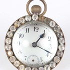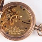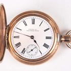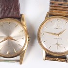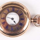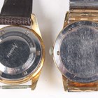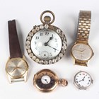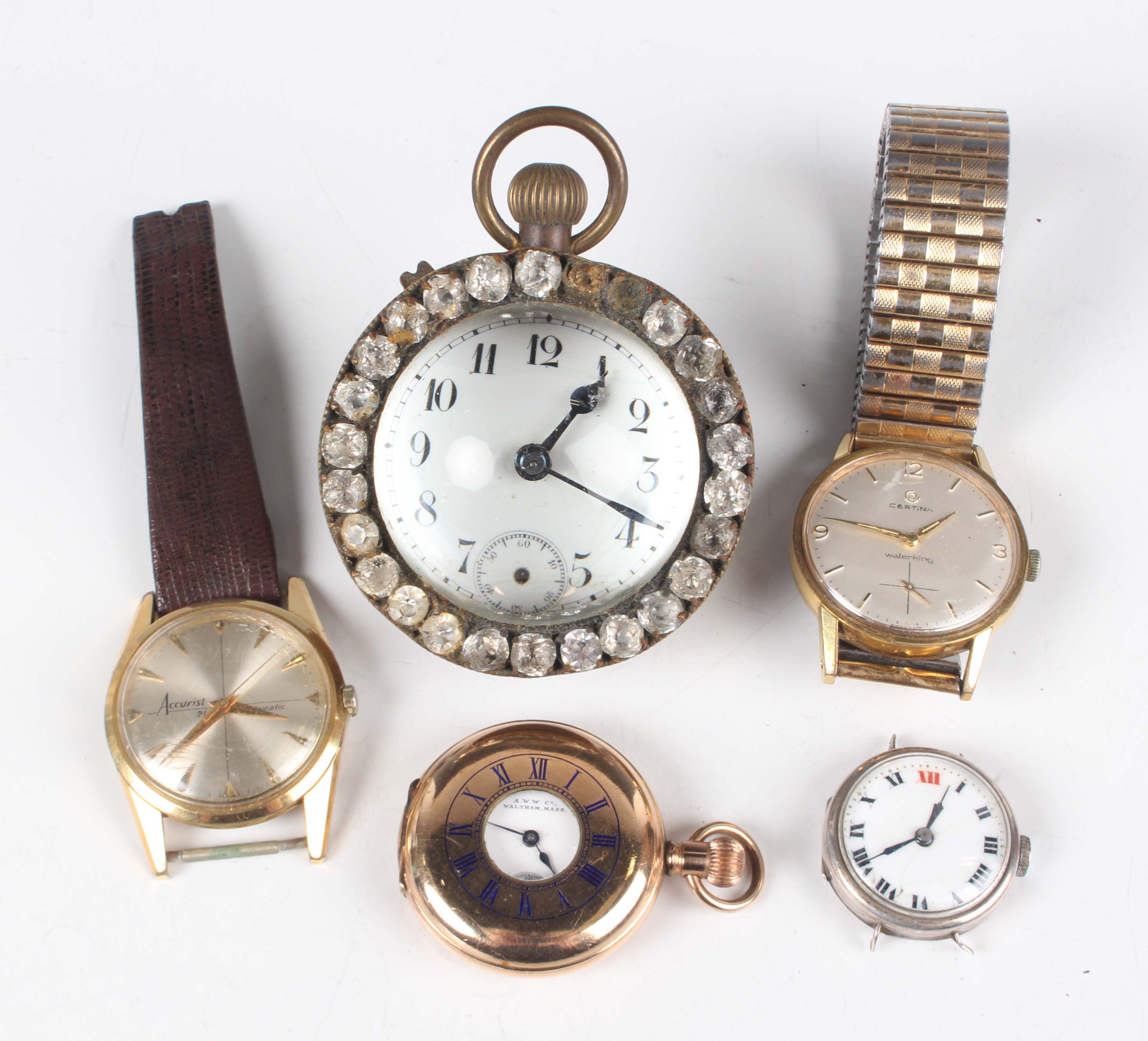 A Waltham gilt metal half hunting cased keyless wind lady's fob watch, case diameter 3.6cm, together with an Accurist gilt metal fronted and steel backed gentleman's wristwatch, case diameter 3.3cm, a Certina Waterking gentleman's wristwatch, case diameter 3.3cm, a silver circular cased lady's wristwatch and a brass magnified glass bullseye desk timepiece with colourless paste set surround, diameter 5.7cm.