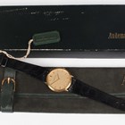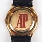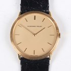 An Audemars Piguet 18ct gold circular cased gentleman's wristwatch with quartz movement, the signed gilt dial with baton hour markers, the case back detailed ' C 10743 Quartz', case diameter 3.1cm, on an Audemars Piguet black leather bracelet with signed gold buckle, detailed '750', with hang tag, green suede case and card box.