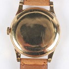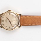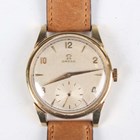An Omega 18ct gold circular cased gentleman's wristwatch with signed and jewelled manual wind movement, the signed silvered dial with gilt Arabic numeral and arrowhead hour markers and subsidiary seconds, case diameter 3.5cm.
