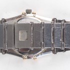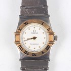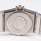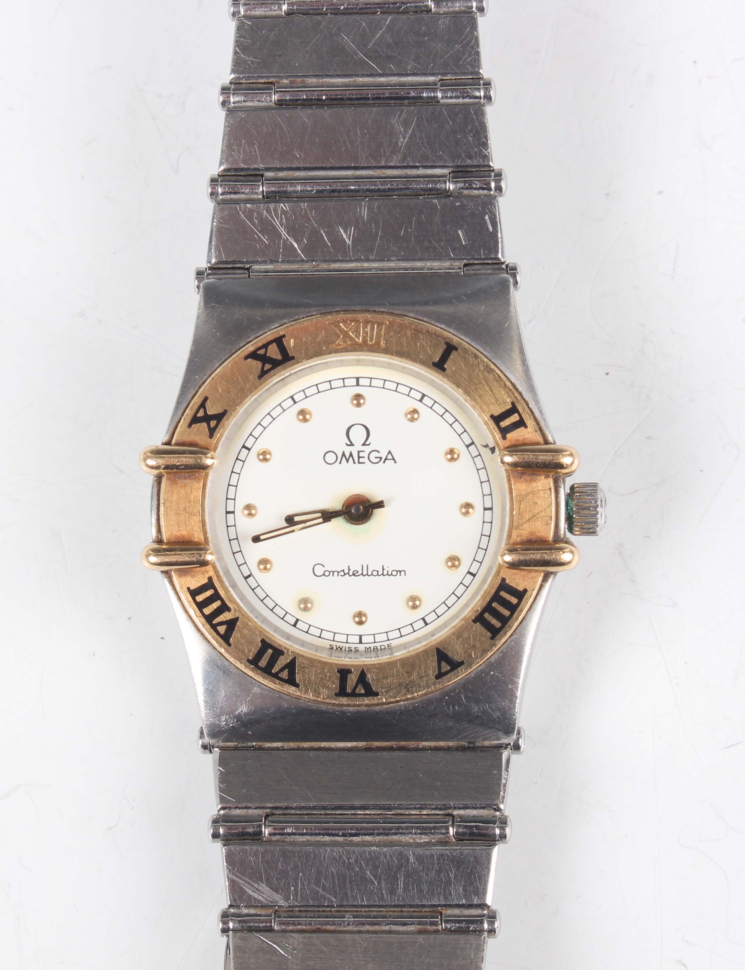An Omega Constellation stainless steel and gold cased lady's bracelet wristwatch, Ref. 795.1076, with signed and jewelled quartz movement, the signed white dial with gilt dot hour markers, the gold bezel with black Roman hour numerals, the signed case back interior numbered '7951076', the tapered link bracelet with signed foldover clasp, case width 2.3cm.