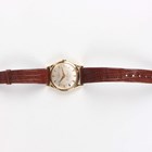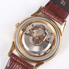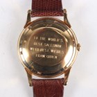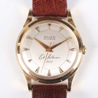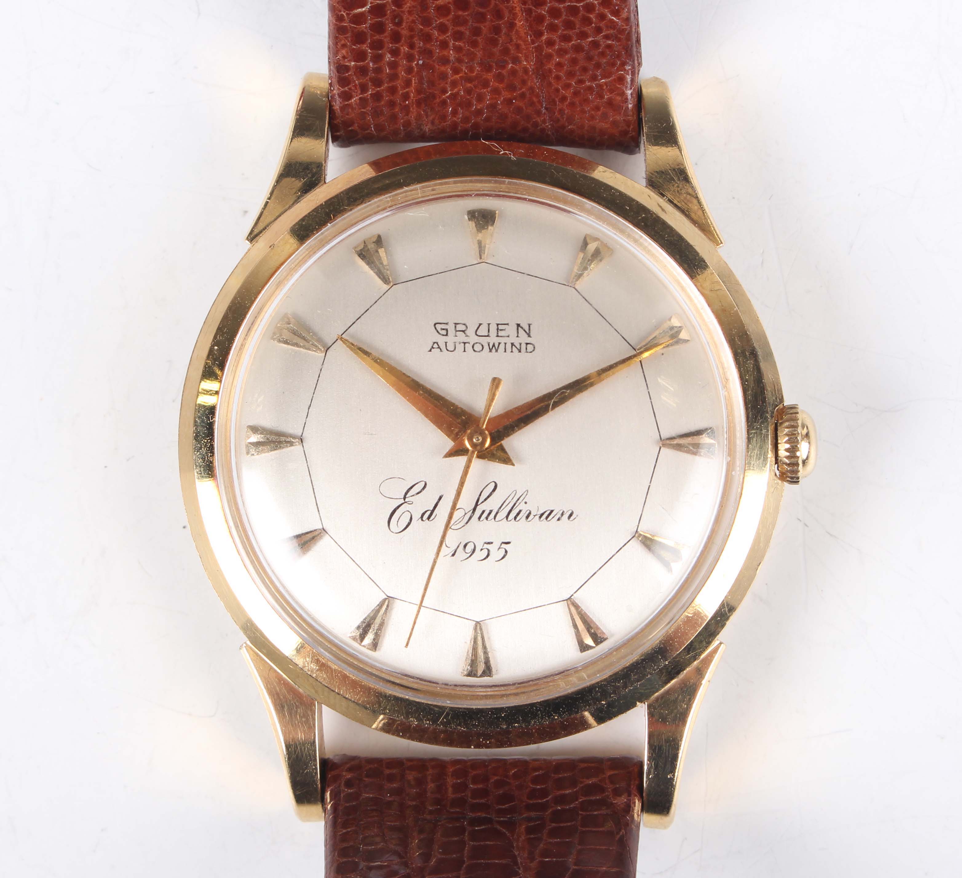 A Gruen Autowind 18K gold circular cased gentleman's wristwatch, the signed and jewelled 930 SS caliber automatic movement, the signed silvered dial with gilt arrowhead hour markers and detailed 'Ed Sullivan 1955', the signed case back interior detailed 'M89199' above '93055-948', the case back detailed '18K', case diameter 3.4cm, the case back with presentation inscription 'To the World's Best Salesman with Best Wishes from Gruen', on a brown leather strap. Note: a gift from Ed Sullivan (1901-1974), legendary American television host, to previous owner in 1955.