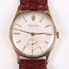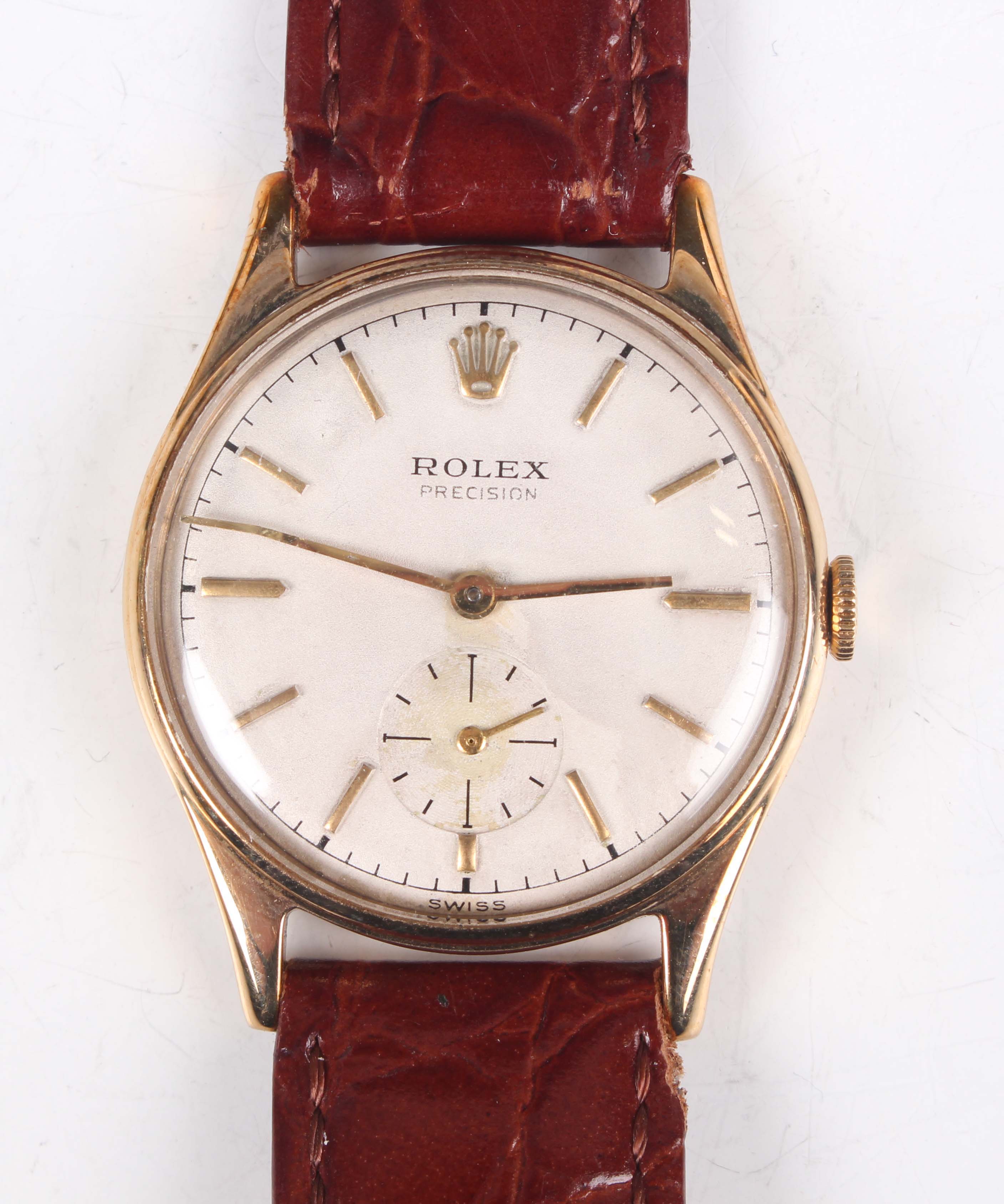 A Rolex Precision 9ct gold circular cased gentleman's wristwatch, Ref. 12868, with signed and jewelled manual wind movement, the signed silvered dial with gilt baton hour markers, Rolex crown at 12 o'clock and subsidiary seconds, the signed case back interior numbered '12868' and '881140', Birmingham 1958, case diameter 3.1cm, on a brown leather strap, with Rolex green leather folding case.
