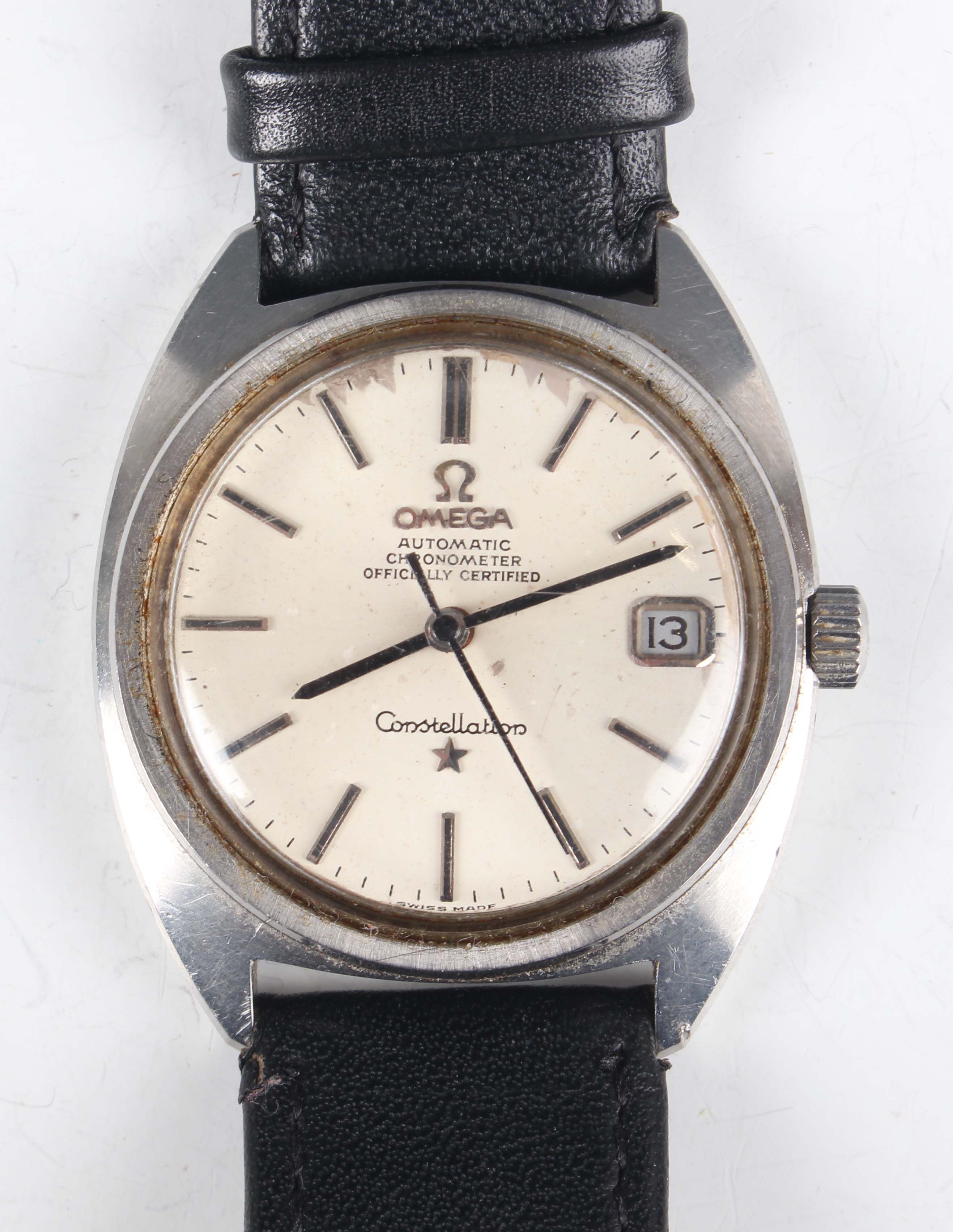 An Omega Constellation stainless steel gentleman's wristwatch, Ref. 168017, circa 1970, the signed and jewelled 564 caliber movement numbered '30417252', the signed silvered dial with baton hour markers and date aperture, the signed case back interior numbered '168017', the case back with Constellation emblem, case width 3.4cm, on a black leather strap.