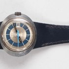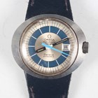 An Omega Automatic Dynamic stainless steel cased lady's wristwatch, the signed silvered and blue dial with blue centre seconds hand and date aperture, case width 3cm, on a black leather strap.