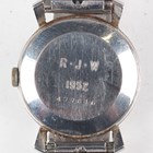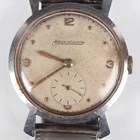 A Jaeger-LeCoultre stainless steel circular cased gentleman's wristwatch, circa late 1940s/50s, the signed and jewelled P480/C caliber manual wind movement numbered '624426', the signed silvered dial with gilt Arabic numeral and dot hour markers and subsidiary seconds, the signed case back with engraved presentation inscription and numbered '477616', case diameter 3cm, on an expanding bracelet.