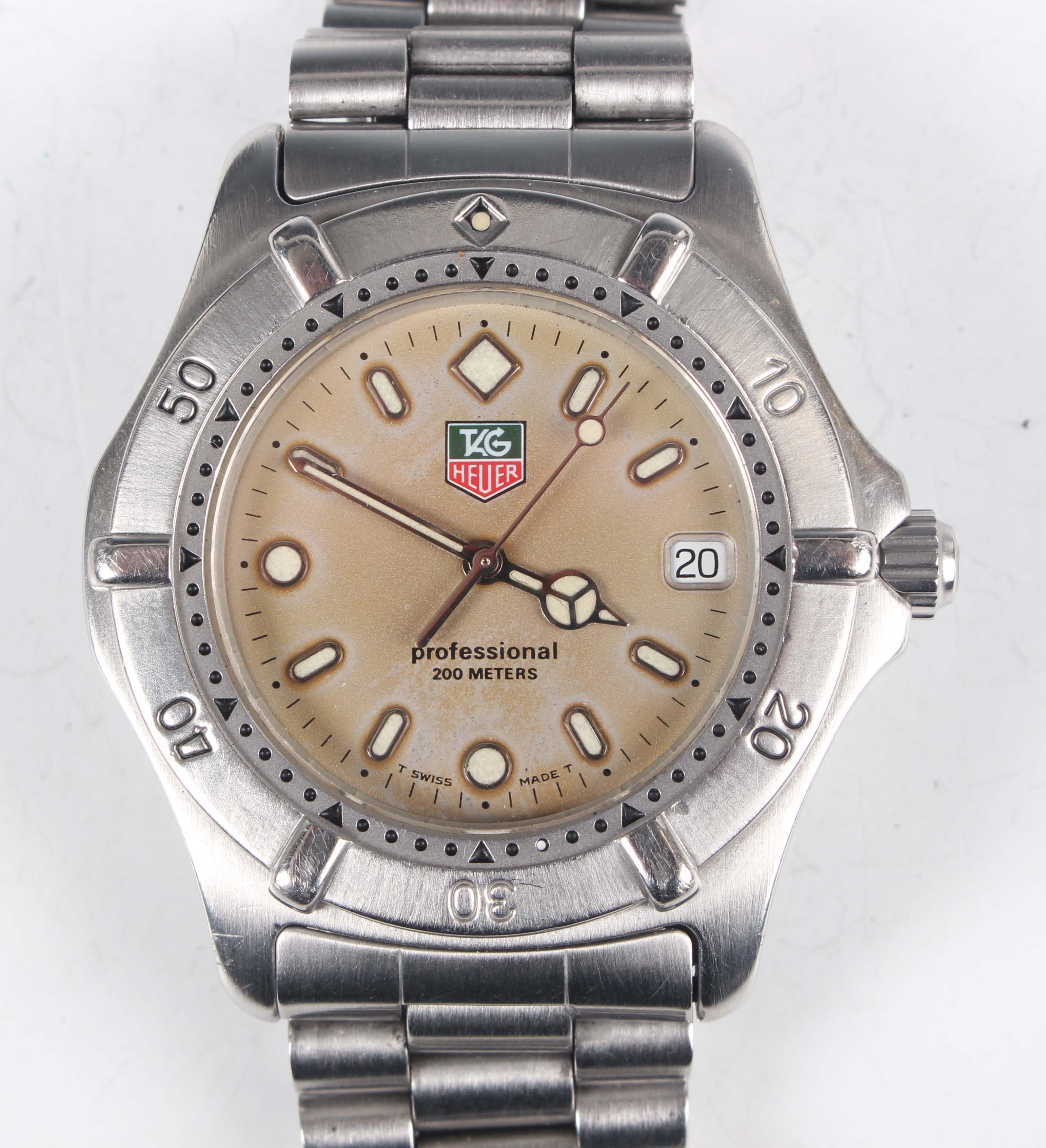 A Tag Heuer Professional 200 Meters stainless steel gentleman's bracelet wristwatch, Ref. WE 1111-R, with quartz movement, the signed dial with date aperture, the case with rotating bezel, the signed case back detailed 'WE1111-R' and '555593', the link bracelet with signed foldover clasp, case width 4cm, with cylindrical case.