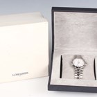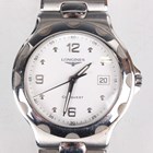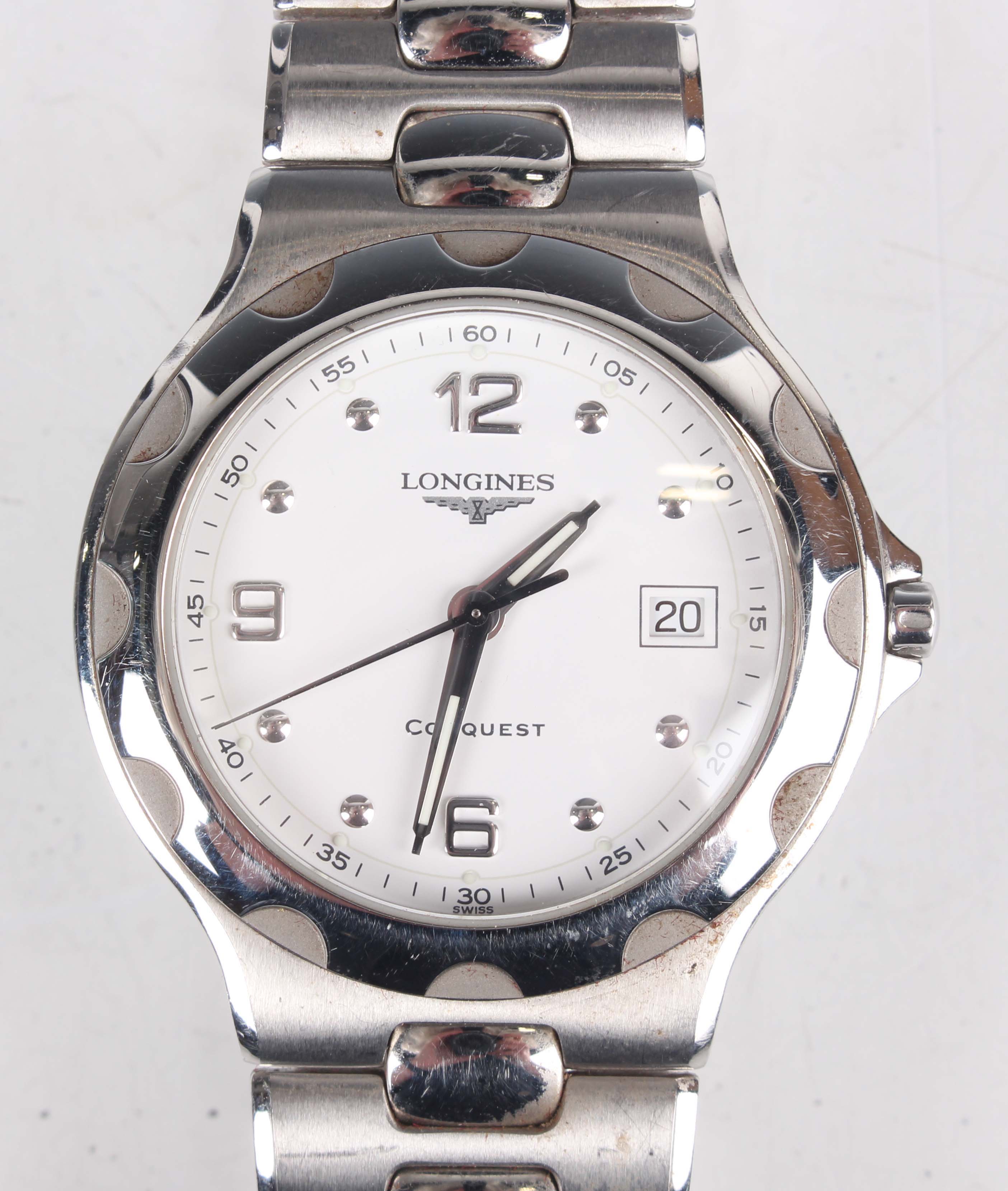 A Longines Conquest stainless steel gentleman's bracelet wristwatch, Ref. L1 633 4, with quartz movement, the signed white dial with centre seconds and date aperture, the signed case back detailed 'L1 6334' and numbered '29372792', the link bracelet with signed foldover clasp, case width 3.9cm, with case and outer card box.