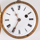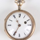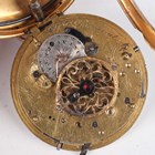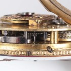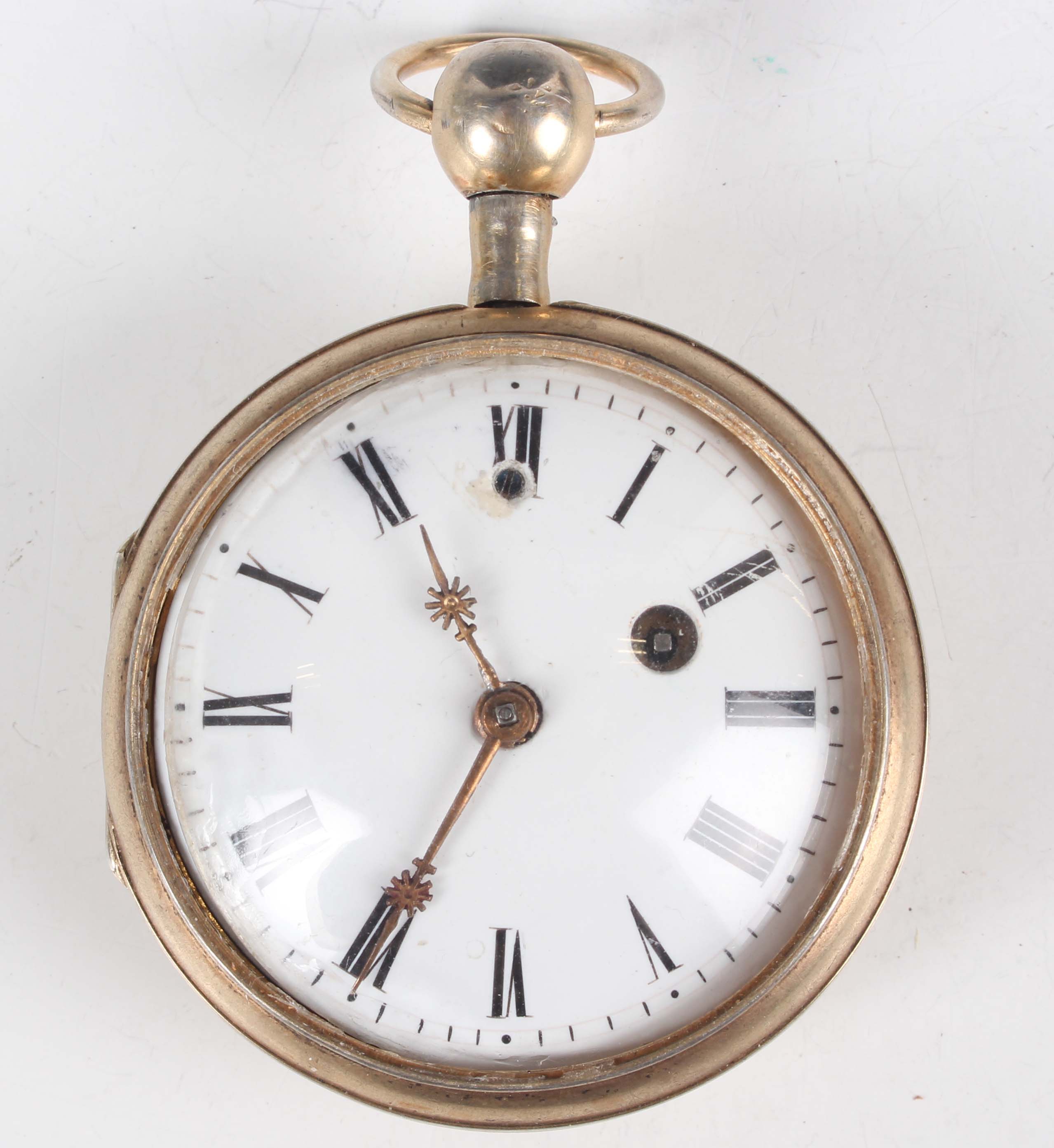 A late 18th/early 19th century Swiss gilt metal cased keywind open-faced quarter repeating gentleman's pocket watch, the gilt fusee movement with verge escapement, pierced and engraved balance cock and plunge repeat with hammer striking on two coiled gongs, the backplate signed 'Fres Becherat a Geneve' and numbered '2035', the white enamelled convex dial with black Roman hour numerals, the gilt metal case with embossed figural panel to back, case diameter 5.1cm.