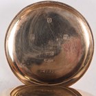 A 9ct gold cased keyless wind open-faced gentleman's pocket watch with unsigned jewelled movement, the white enamelled dial with black Roman hour numerals and subsidiary seconds, the gold inner case detailed 'Dennison', Birmingham 1933, total weight 78.1g, case diameter 4.8cm, together with a Victorian gilt metal vesta case with foliate engraved decoration, detailed 'Rolled Gold', and an Albert watch chain.