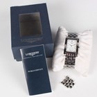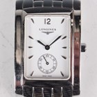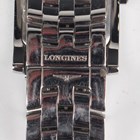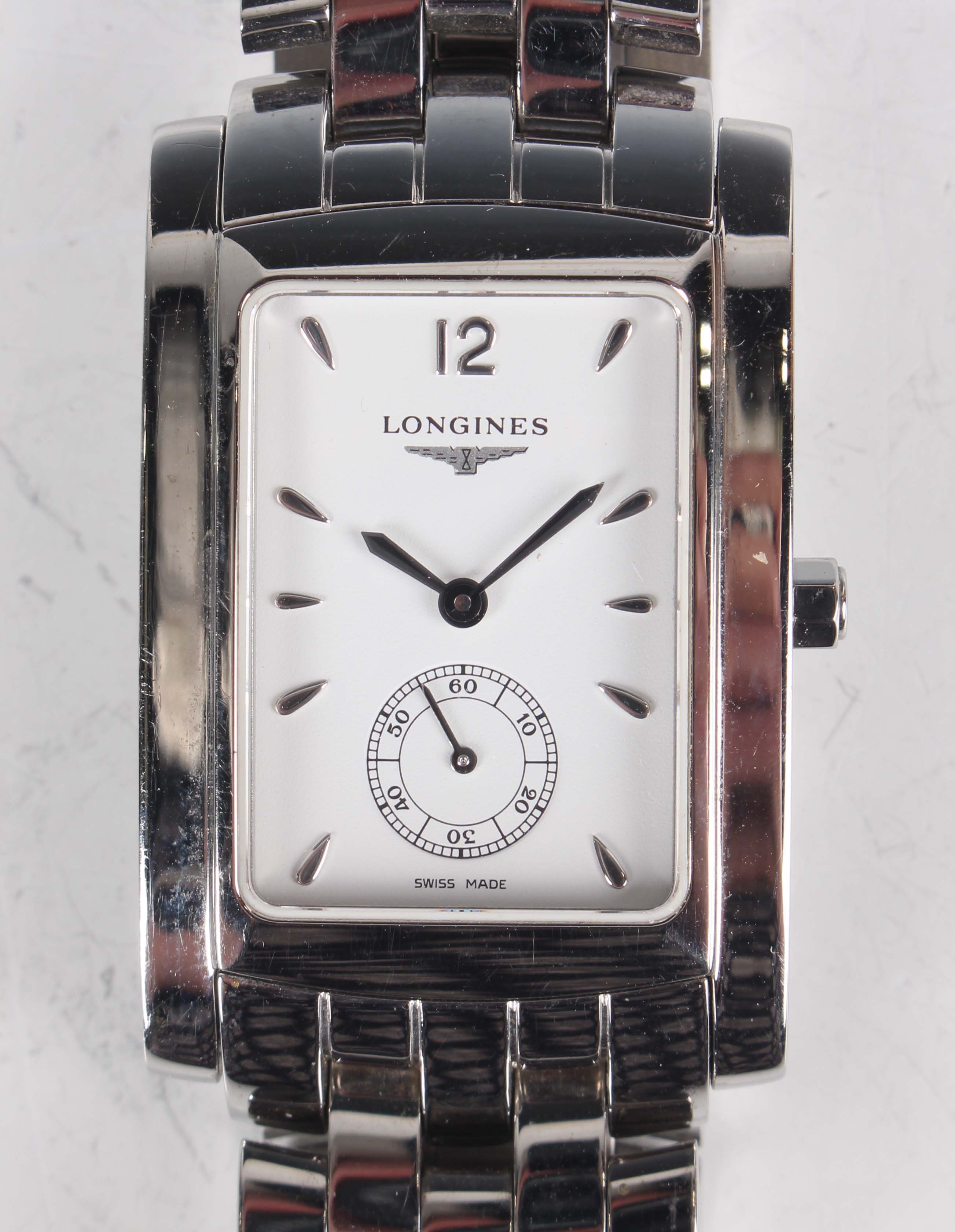 A Longines stainless steel rectangular cased gentleman's bracelet wristwatch, Ref. L5 655 4, with quartz movement, the signed white dial with silvered hour markers and subsidiary seconds, the link bracelet with signed foldover clasp, case width 2.6cm, with case and two spare links.