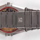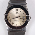 An Omega Constellation Chronometer Quartz stainless steel gentleman's bracelet wristwatch, Ref. 1980140, with ETA quartz movement, the signed silvered dial with Roman hour numerals and date aperture, the case with black bezel, the case back with Constellation emblem and detailed '85' over '1431', the signed case back interior numbered '1980140' above '3980866', the tapered link bracelet with signed foldover clasp, case width 3.4cm.