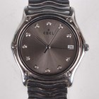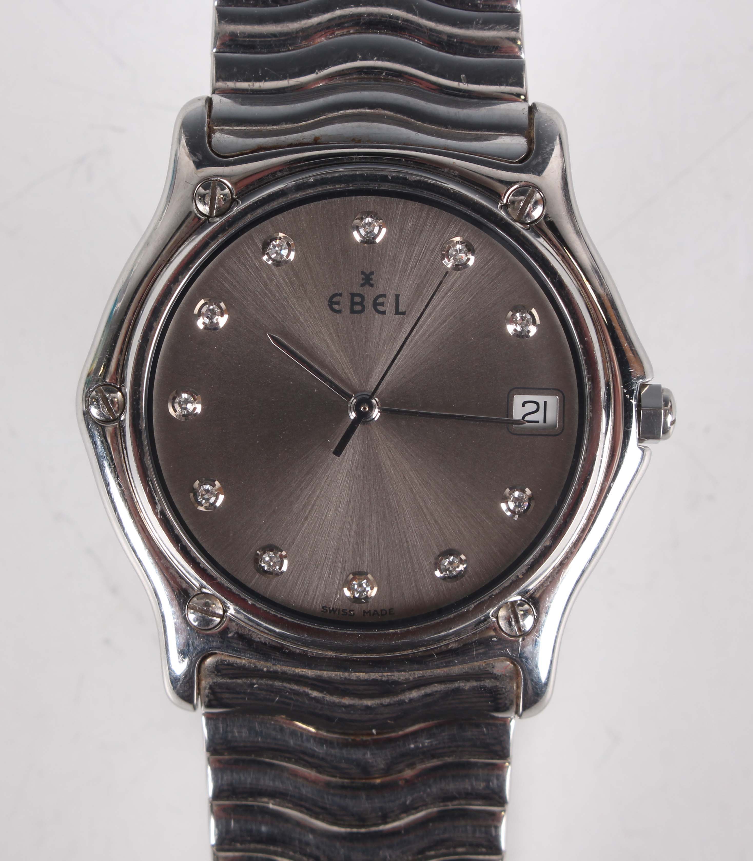 An Ebel Classic Wave stainless steel gentleman's bracelet wristwatch, Ref. 9187142', with quartz movement, the signed silvered dial with diamond set hour markers and date aperture, the case back detailed '54503828' above 'E 9187142', the wave link bracelet with foldover clasp, case width 3.5cm.