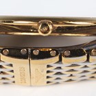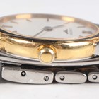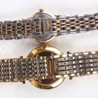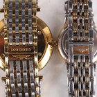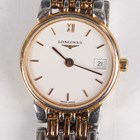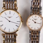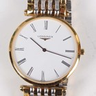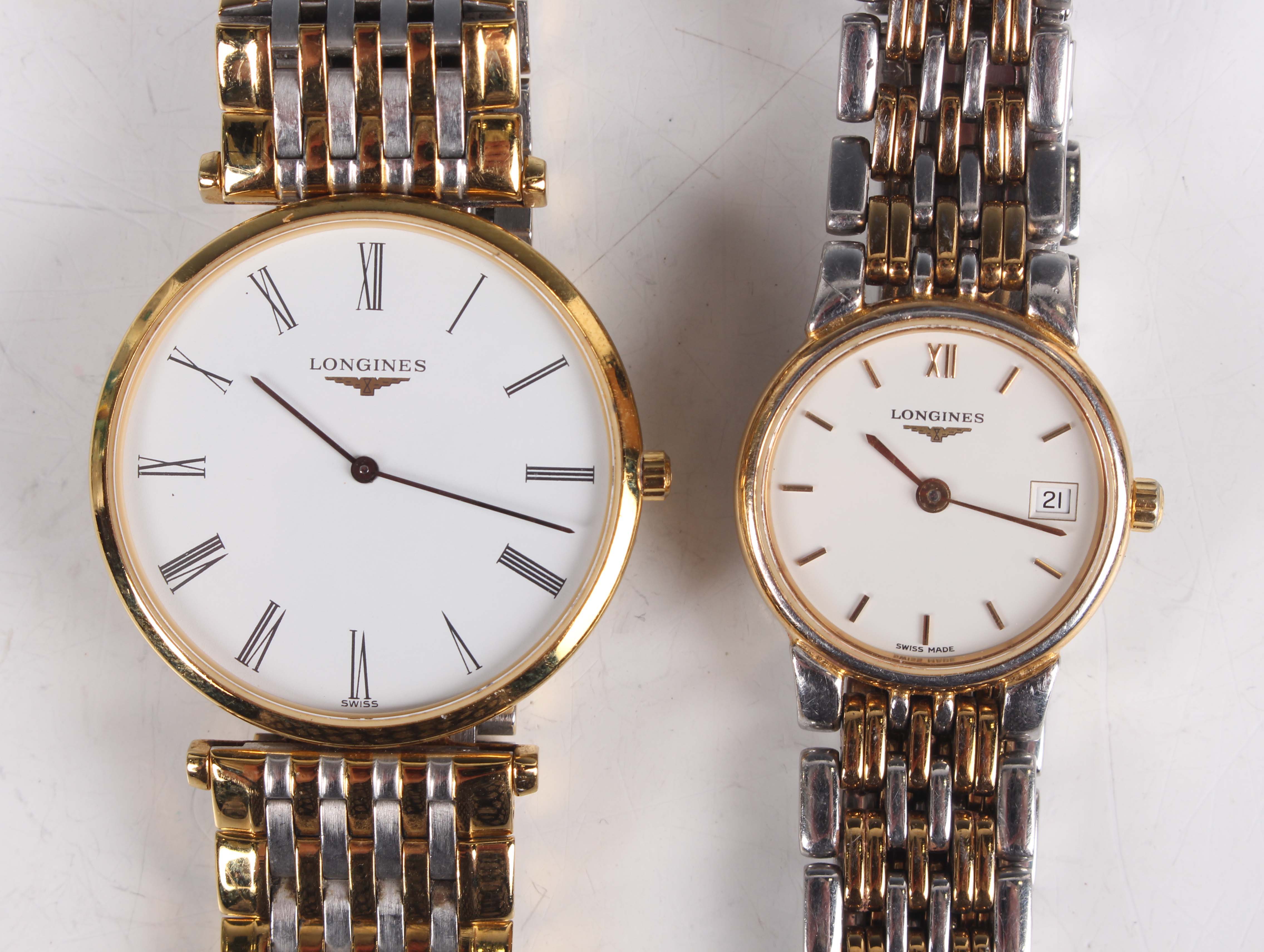 A Longines La Grande Classique de Longines gilt metal and steel gentleman's bracelet wristwatch, Ref. L4 709 2, with quartz movement, the signed white enamelled dial with black Roman hour numerals, the link bracelet with signed foldover clasp, case diameter 3.2cm, together with a similar Longines lady's bracelet wristwatch, Ref. L5.1323, case diameter 2.3cm.