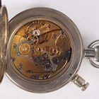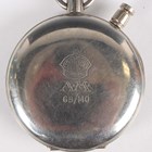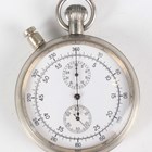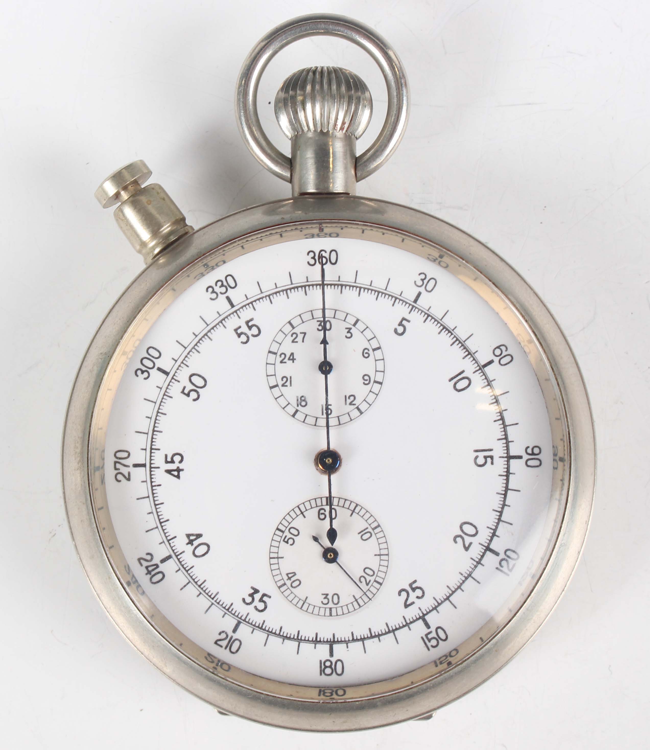 A British Air Ministry nickel plate cased keyless wind split-second stopwatch with unsigned jewelled gilt lever movement, the white enamelled dial with black Arabic numerals, the case back with engraved crown above 'A.M' and '6B/140', case diameter 5.9cm.