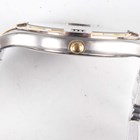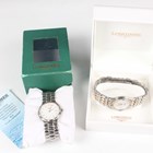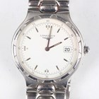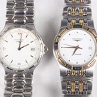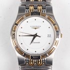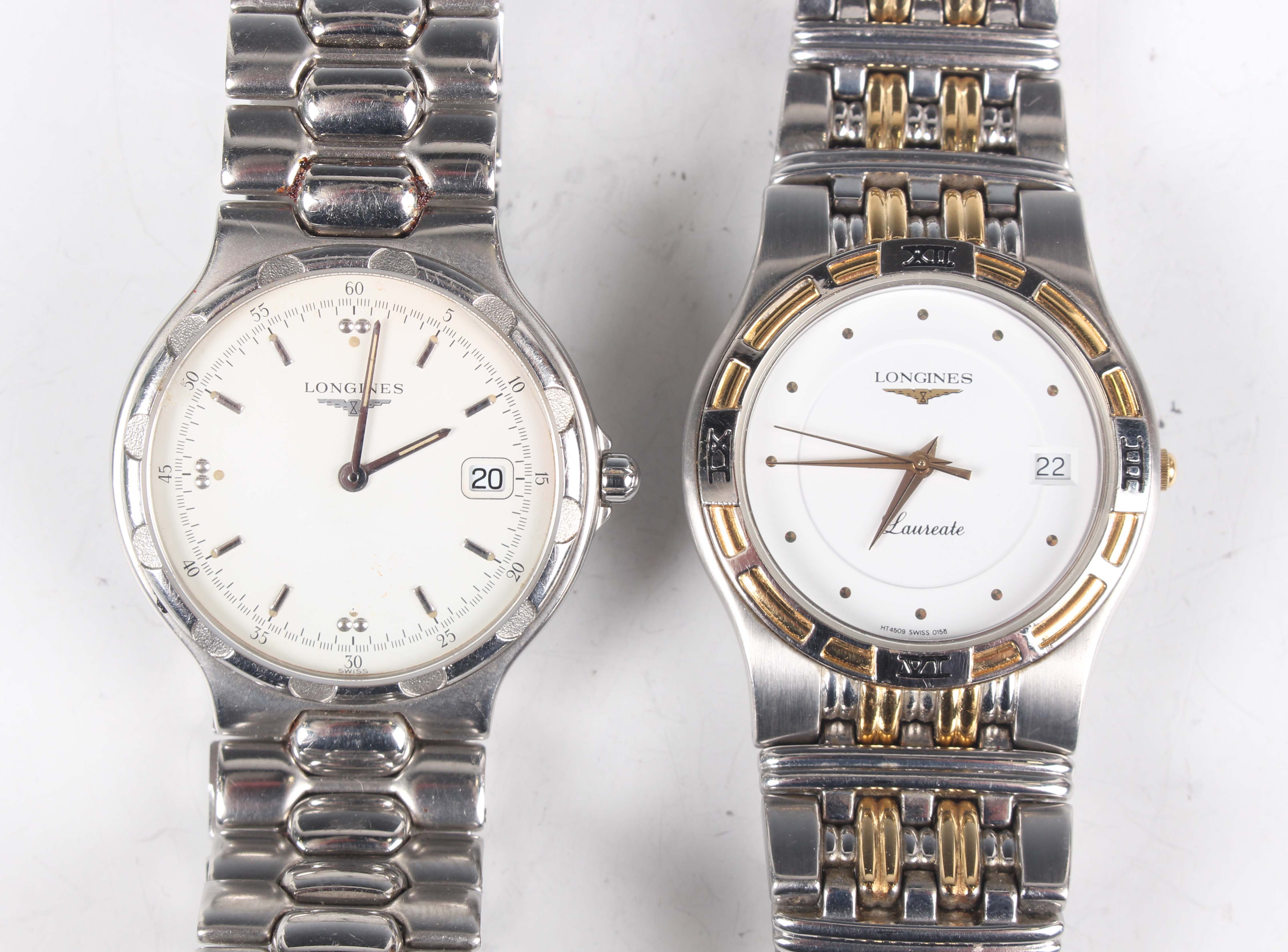A Longines Conquest stainless steel circular cased gentleman's bracelet wristwatch with quartz movement, the signed white dial with date aperture, the link bracelet with signed double foldover clasp, case diameter 3.4cm, with a case, together with a Longines Laureate stainless steel and gilt gentleman's bracelet wristwatch with quartz movement, the signed white dial with date aperture, the link bracelet with double foldover clasp, case width 3.2cm, with case.