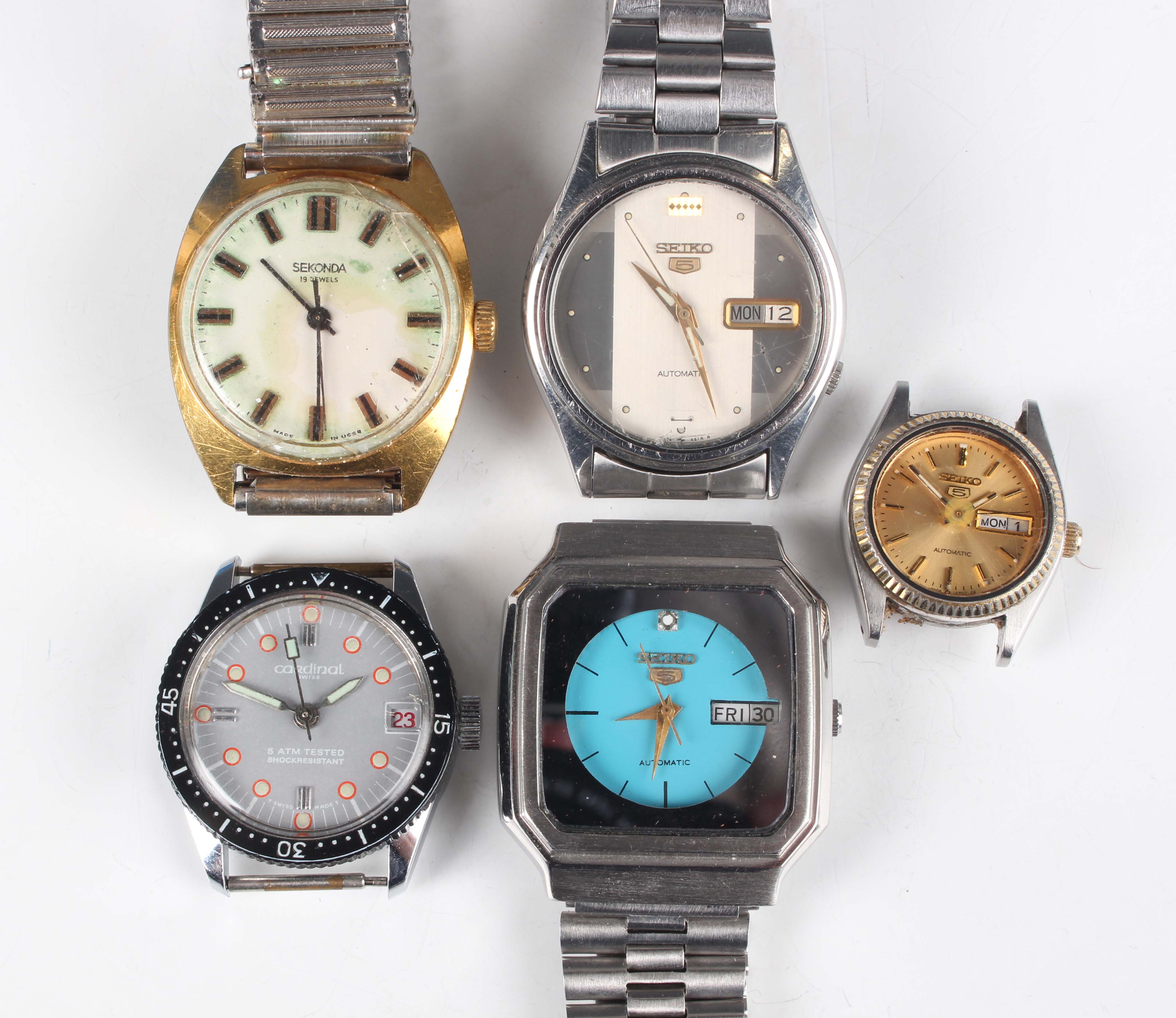 A Seiko 5 Automatic stainless steel gentleman's bracelet wristwatch, Ref. 7009-3100, the tapered link bracelet with signed foldover clasp, case width 3.5cm, together with a Seiko 5 Automatic steel cased gentleman's wristwatch, Ref. 6349-5030, case width 3.5cm, a Seiko 5 Automatic lady's wristwatch, a Sekonda gentleman's wristwatch and a Cardinal wristwatch, case diameter 3.2cm.