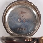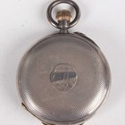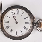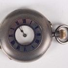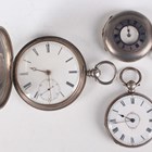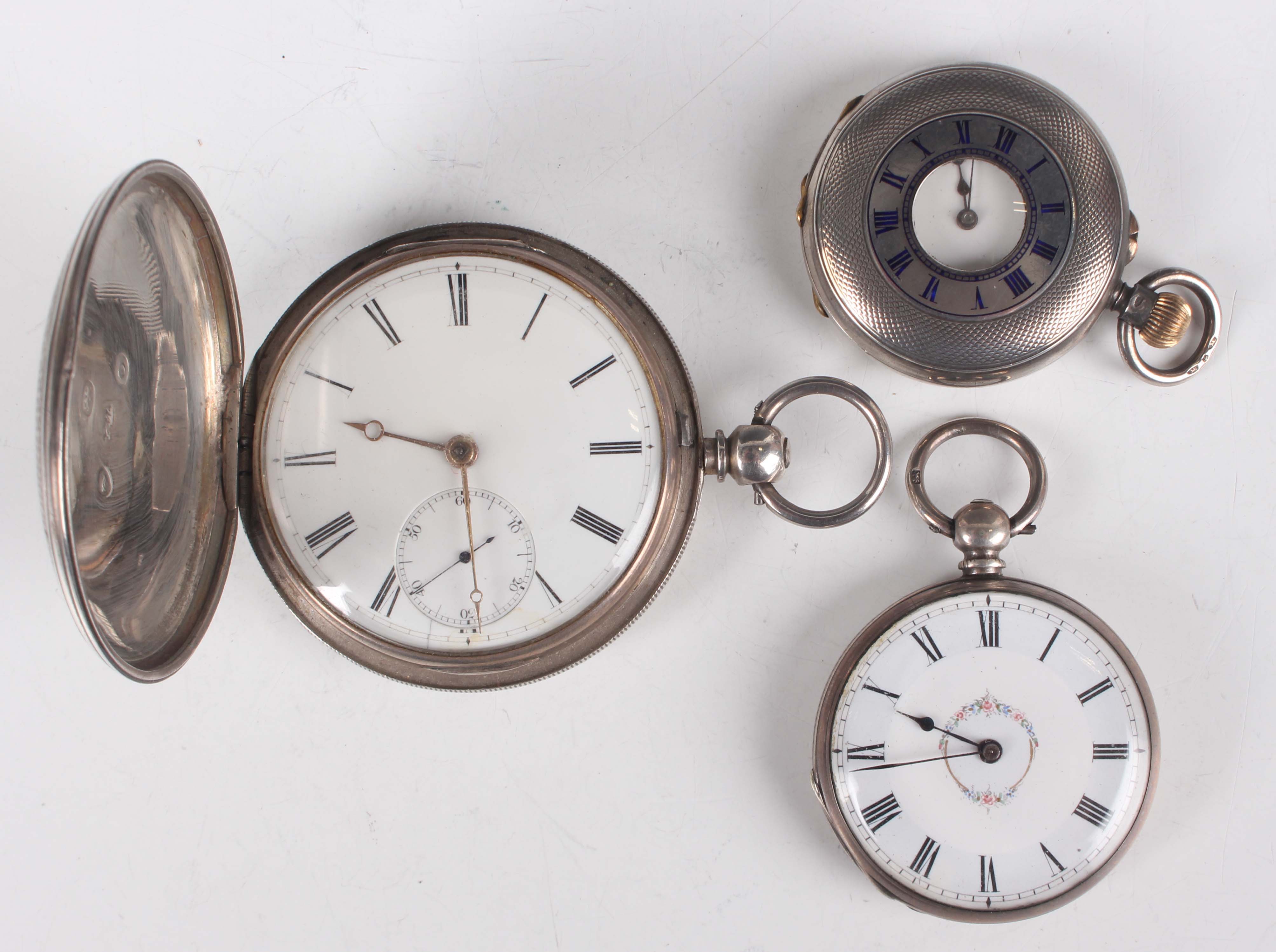 A Swiss silver half-hunting cased keyless wind lady's fob watch with inscribed gilt lever movement and white enamelled dial, the case with engine turned decoration, case diameter 3.6cm, total weight 48.1g, together with a silver hunting cased keywind gentleman's pocket watch, the case with engine turned decoration, case diameter 5.2cm, total weight 103.3g, and a Swiss silver lady's fob watch, case diameter 3.8cm, total weight 42.3g.