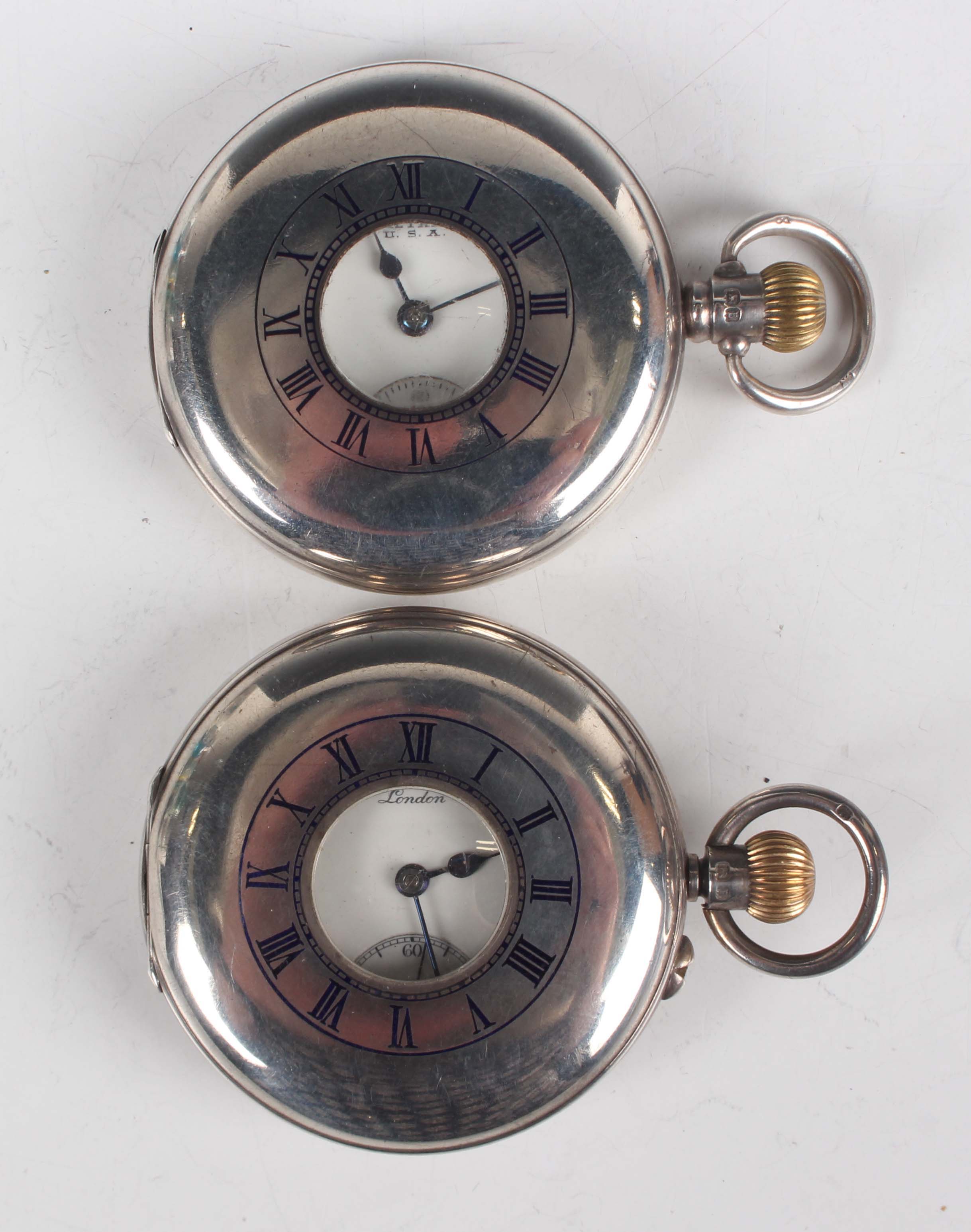 A Waltham U.S.A. silver half hunting cased keyless wind gentleman's pocket watch with signed lever movement, the signed white enamelled dial with black Arabic hour numerals and subsidiary seconds, silver inner case, Birmingham 1926, case diameter 5cm, total weight 110.5g, together with a similar J.W. Benson silver half hunting cased keyless wind gentleman's pocket watch, the gilt three-quarter plate movement detailed 'J.W. Benson The Bank Best London Make 7281', London 1934, case diameter 5cm, total weight 96.5g.