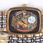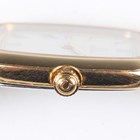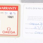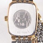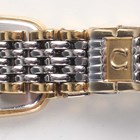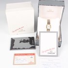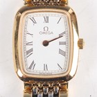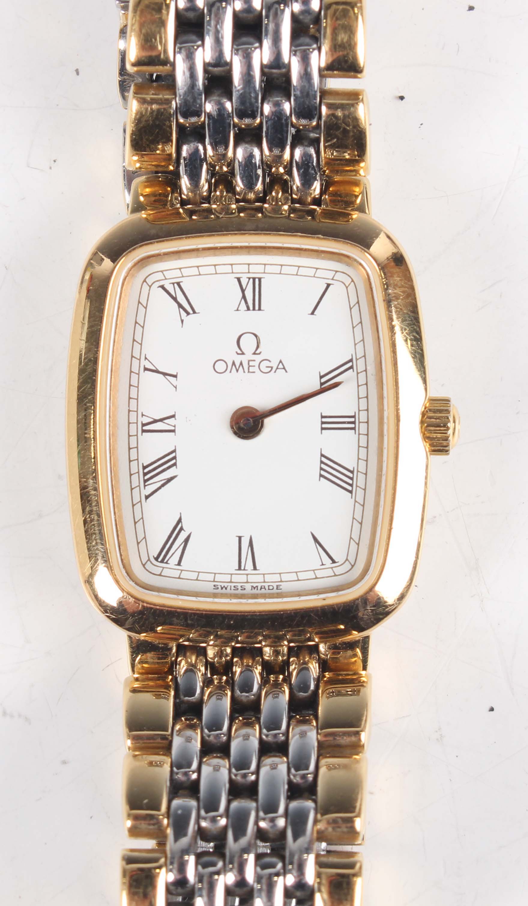 An Omega stainless steel and gilt lady's bracelet wristwatch, Ref. 795. 0899. 2, circa 1991, with quartz movement, the signed white rectangular dial with black Roman hour numerals, the link bracelet with signed foldover clasp, case width 1.8cm, with case and outer card box.