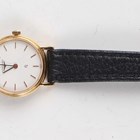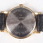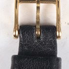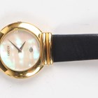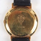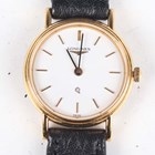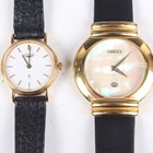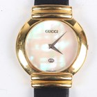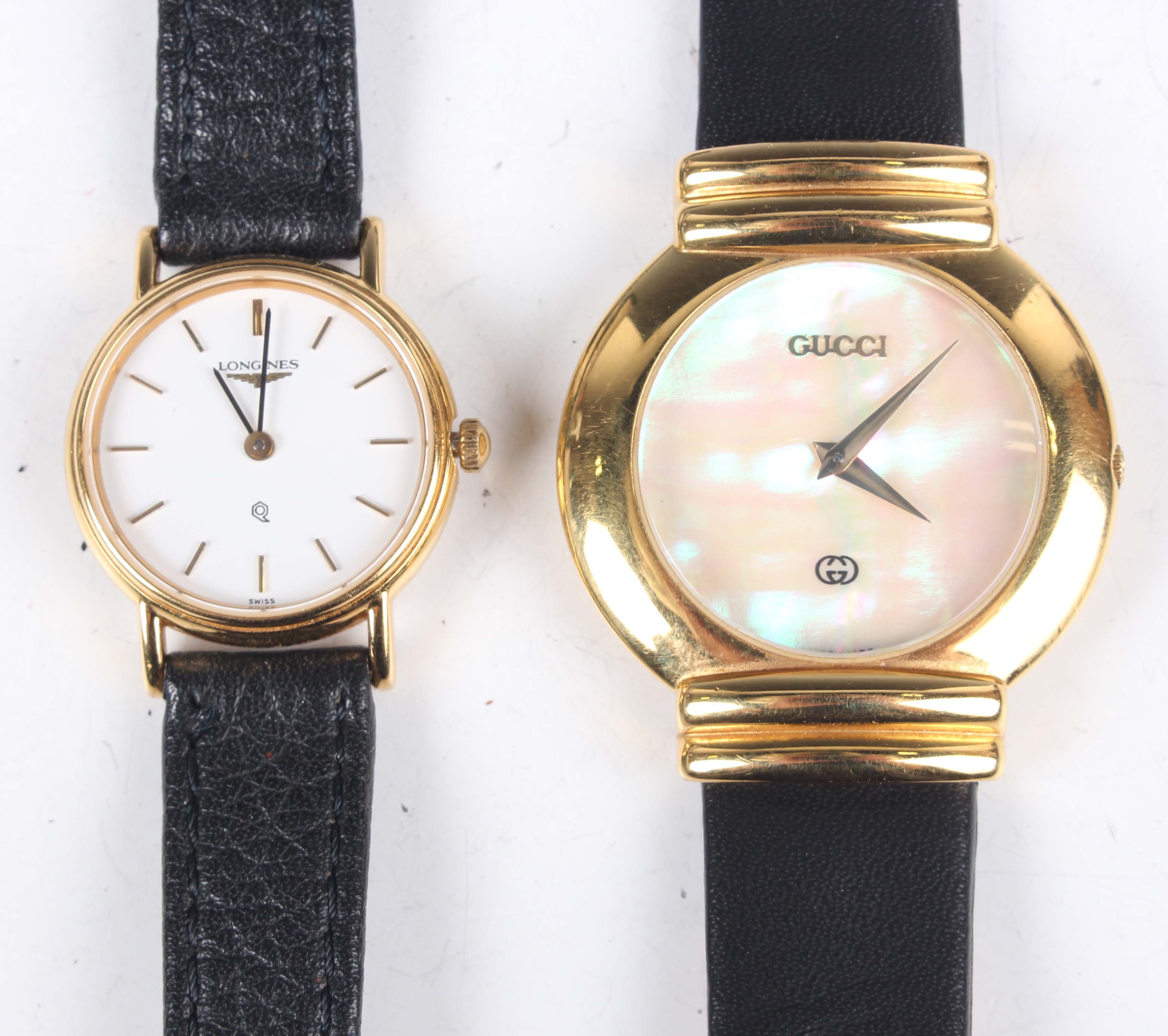 A Longines gilt metal fronted and steel backed circular cased lady's wristwatch with quartz movement, the signed white dial with gilt baton hour markers, case diameter 2.3cm, on a black leather strap, with case, outer card box and guarantee card, dated '16.4.99', together with a Gucci gilt metal circular cased gentleman's wristwatch, Ref. 5300M, with quartz movement and signed mother-of-pearl dial, case diameter 3.3cm, on a black leather strap with Gucci buckle, with case and outer card box.