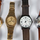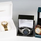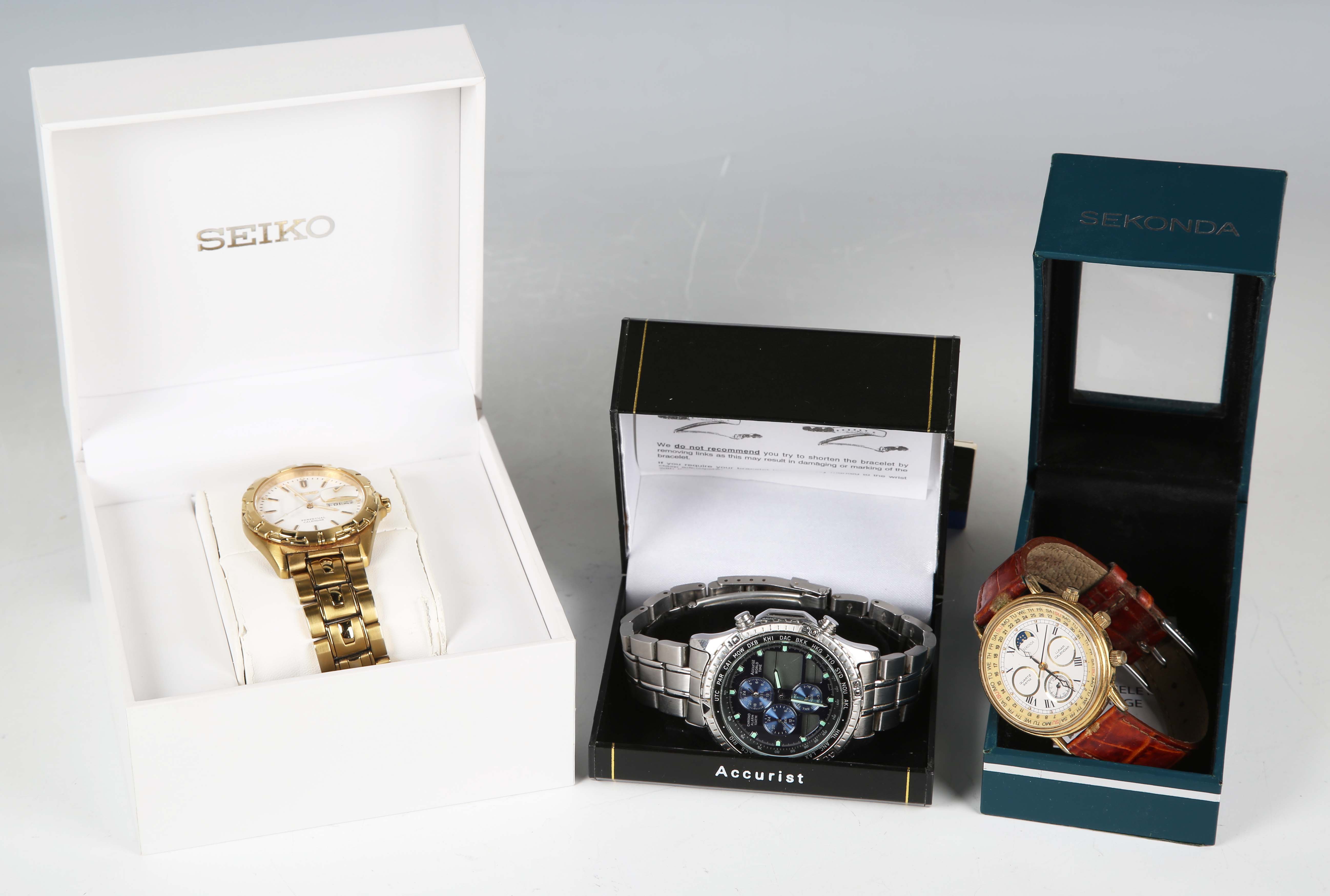 A group of seven gentlemen's wristwatches, comprising a Seiko Perpetual Calendar gilt metal and steel backed bracelet wristwatch, Ref. 8F33-0029, case width 3.7cm, with instructions and warranty card, dated '02/03/2000', a Seiko Twin Quartz gilt metal gentleman's bracelet wristwatch, Ref. 9723-8000, case width 3.6cm, an Oris gilt metal fronted and steel backed wristwatch with jewelled manual wind movement, case diameter 3.5cm, three Sekonda watches and an Accurist Word Time Alarm Chronograph wristwatch, boxed.
