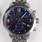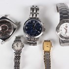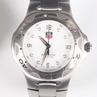 A Tag Heuer Professional 200 Meters stainless steel gentleman's bracelet wristwatch, Ref. WL1110-0, with quartz movement, the signed white dial with dot hour markers and date aperture, the case with rotating bezel, the bracelet with signed foldover clasp, case width 4cm, together with a Tissot PRC 200 stainless steel gentleman's chronograph bracelet wristwatch, Ref. T055417A, with quartz movement and signed blue dial, case diameter 4.2cm, a Ritmo Mundo gentleman's wristwatch with jewelled manual wind movement, case width 4.7cm, an Omega steel and gilt lady's bracelet wristwatch, case width 1.8cm, and a Raymond Weil steel lady's bracelet wristwatch, case width 2.4cm.