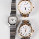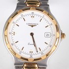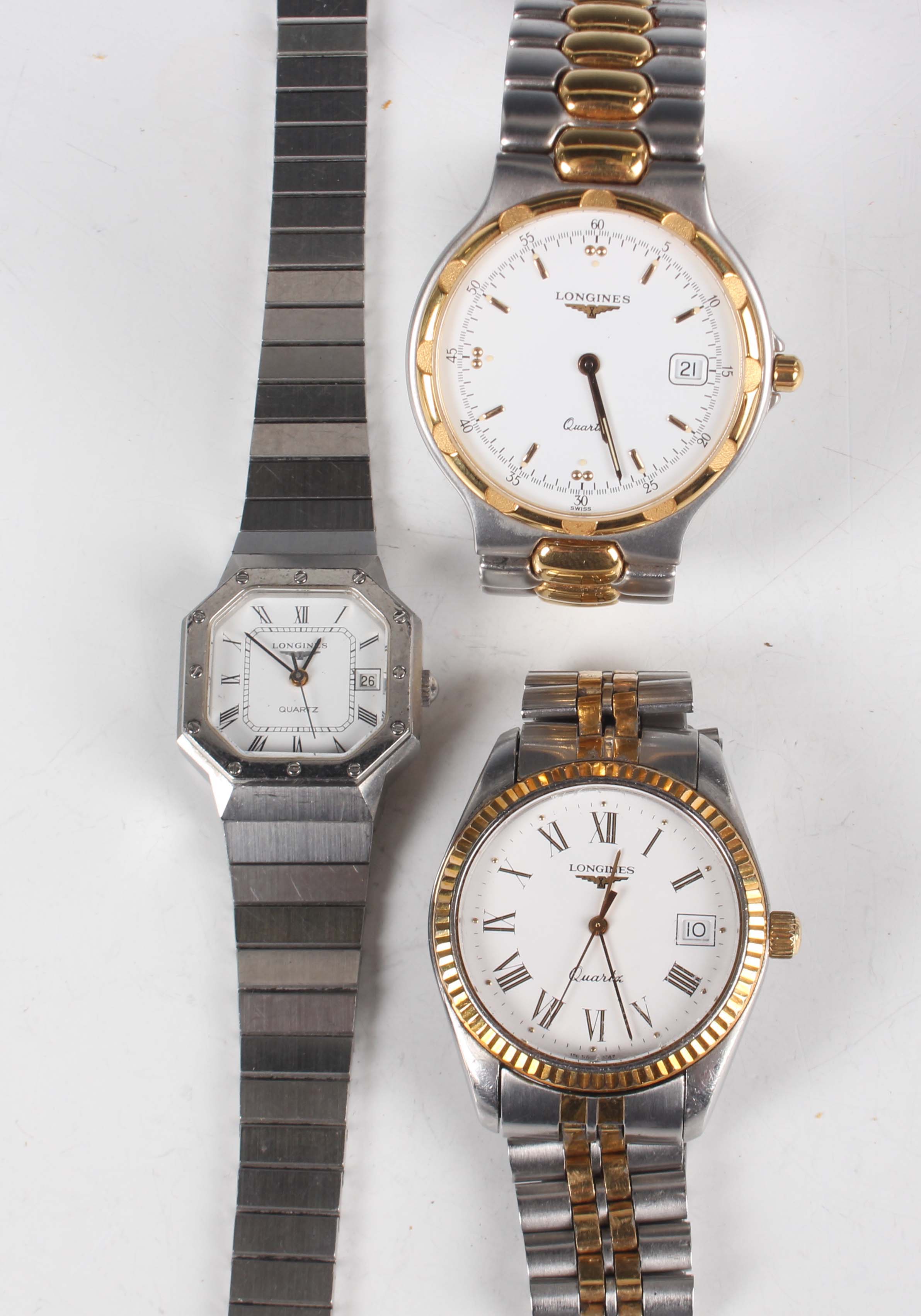A Longines Conquest Quartz stainless steel and gilt gentleman's bracelet wristwatch, the signed white dial with gilt hour markers and date aperture, case diameter 3.5cm, together with a Longines Quartz stainless steel and gilt cased gentleman's wristwatch, case diameter 3.2cm, and a Longines Quartz steel lady's bracelet wristwatch, case width 2.4cm.