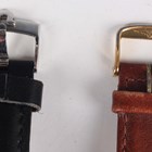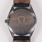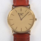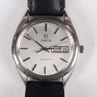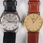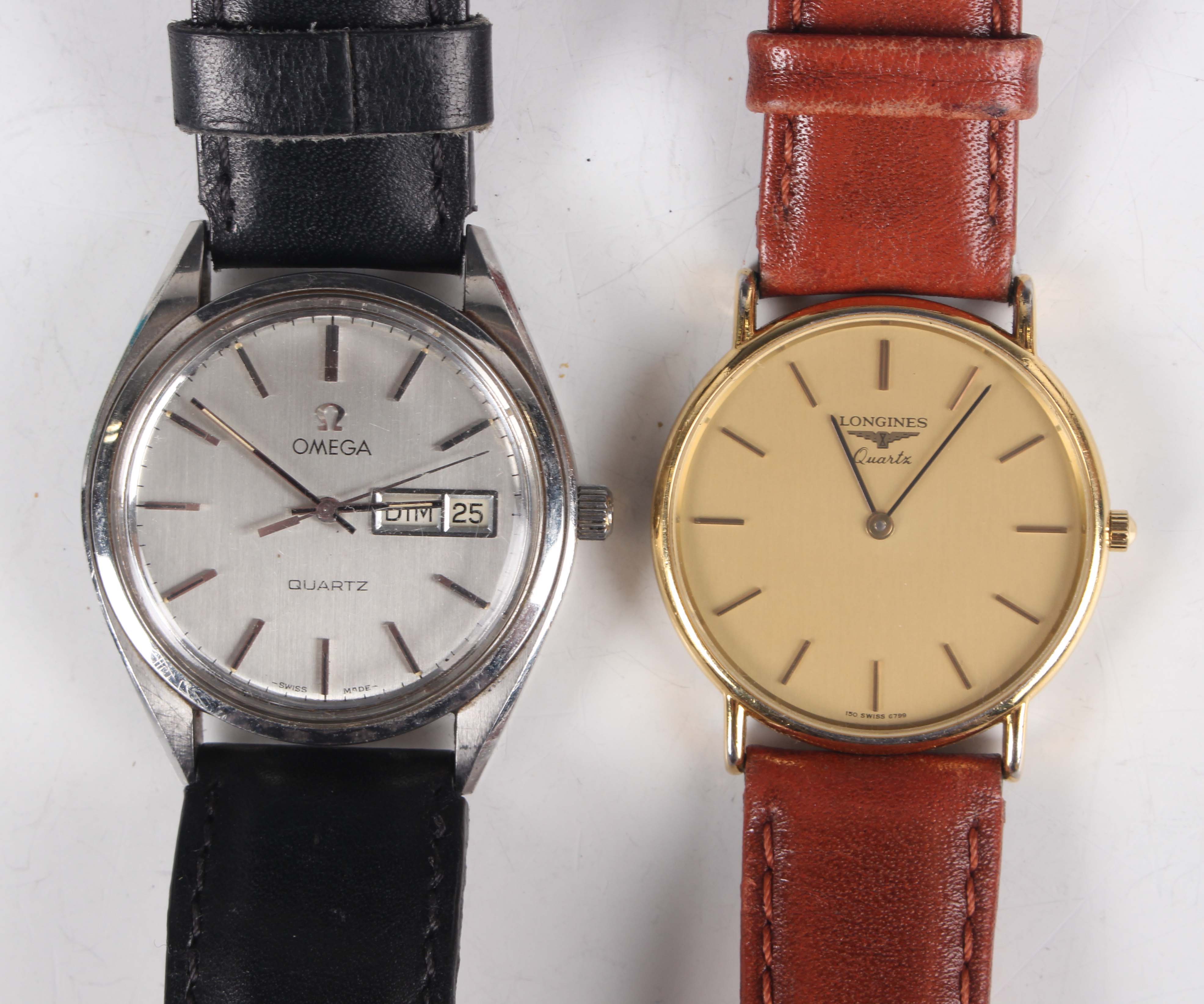 A Longines Quartz gilt metal fronted and steel backed gentleman's wristwatch with signed gilt dial, case diameter 3.2cm, on a brown leather strap, together with an Omega Quartz stainless steel cased gentleman's wristwatch, Ref. 196 0124, circa 1976, the signed and jewelled 1345 caliber movement numbered '40687116', the signed silvered dial with baton hour markers and day and date apertures, case width 3.5cm, on a black leather strap.
