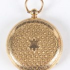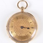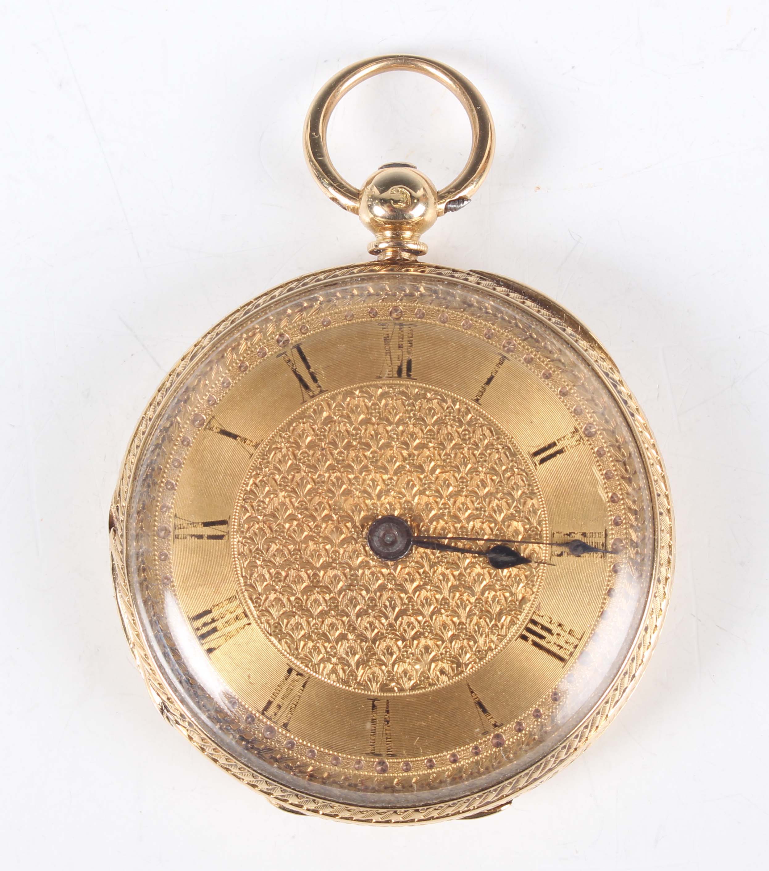 An 18ct gold keywind open-faced pocket watch, the jewelled three-quarter plate movement detailed 'W.B. Box 21 Upper Charles St Northampton Sque London 8747', the gilt dial with black Roman hour numerals, the case with engraved decoration, London 1861, total weight 44.3g, case diameter 3.6cm.