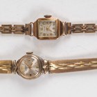 A 14K gold rectangular cased lady's wristwatch, detailed '0.585', on a rolled gold bracelet, case width 1.2cm, together with a Rotary gilt metal lady's bracelet wristwatch, case diameter 1.5cm.