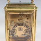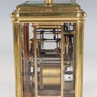 A late 19th century French lacquered brass gorge cased carriage clock, the eight day movement with platform escapement striking and repeating on a gong, the white enamelled dial with black Roman hour numerals, the case with swing handle and bevelled glass panels, height 17cm, with winding key.