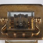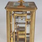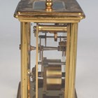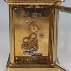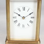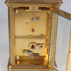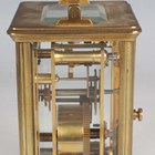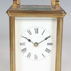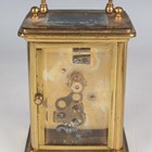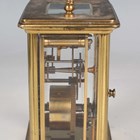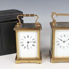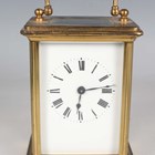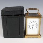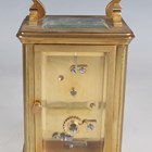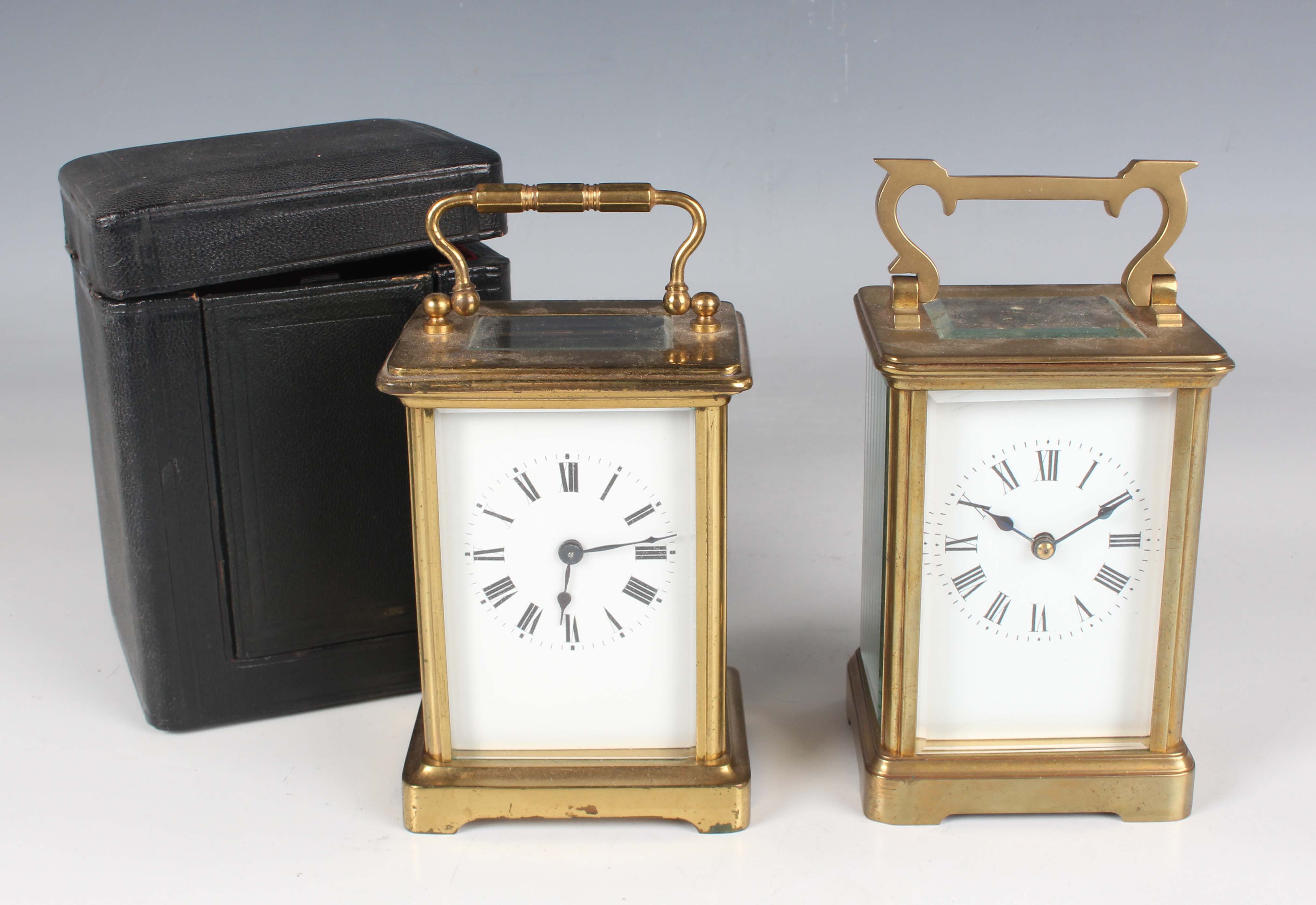 Two late 19th/early 20th century French brass corniche cased carriage timepieces, each with eight day movement and platform escapement, white enamelled dial and glazed case with swing handle, heights 14.4cm and 14.8cm, one with leather mounted travelling case.