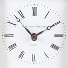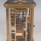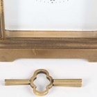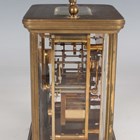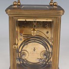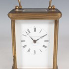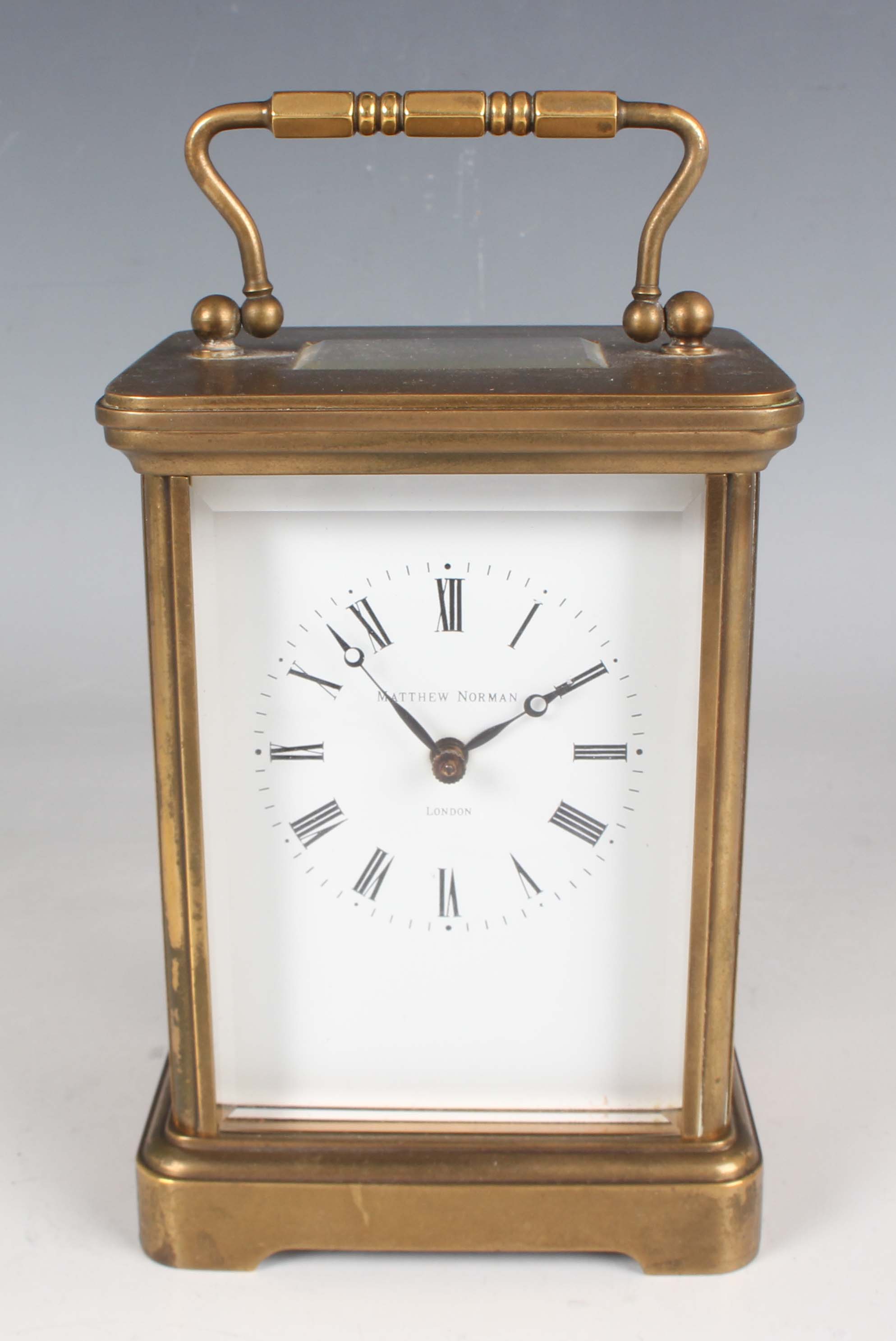 A late 20th century brass corniche cased carriage clock by Matthew Norman, with eight day movement striking hours on a gong, the signed white enamelled dial with black Roman hour numerals, the case with swing handle above bevelled glass panels, on bracket feet, height 17.5cm.