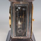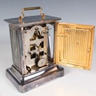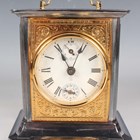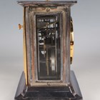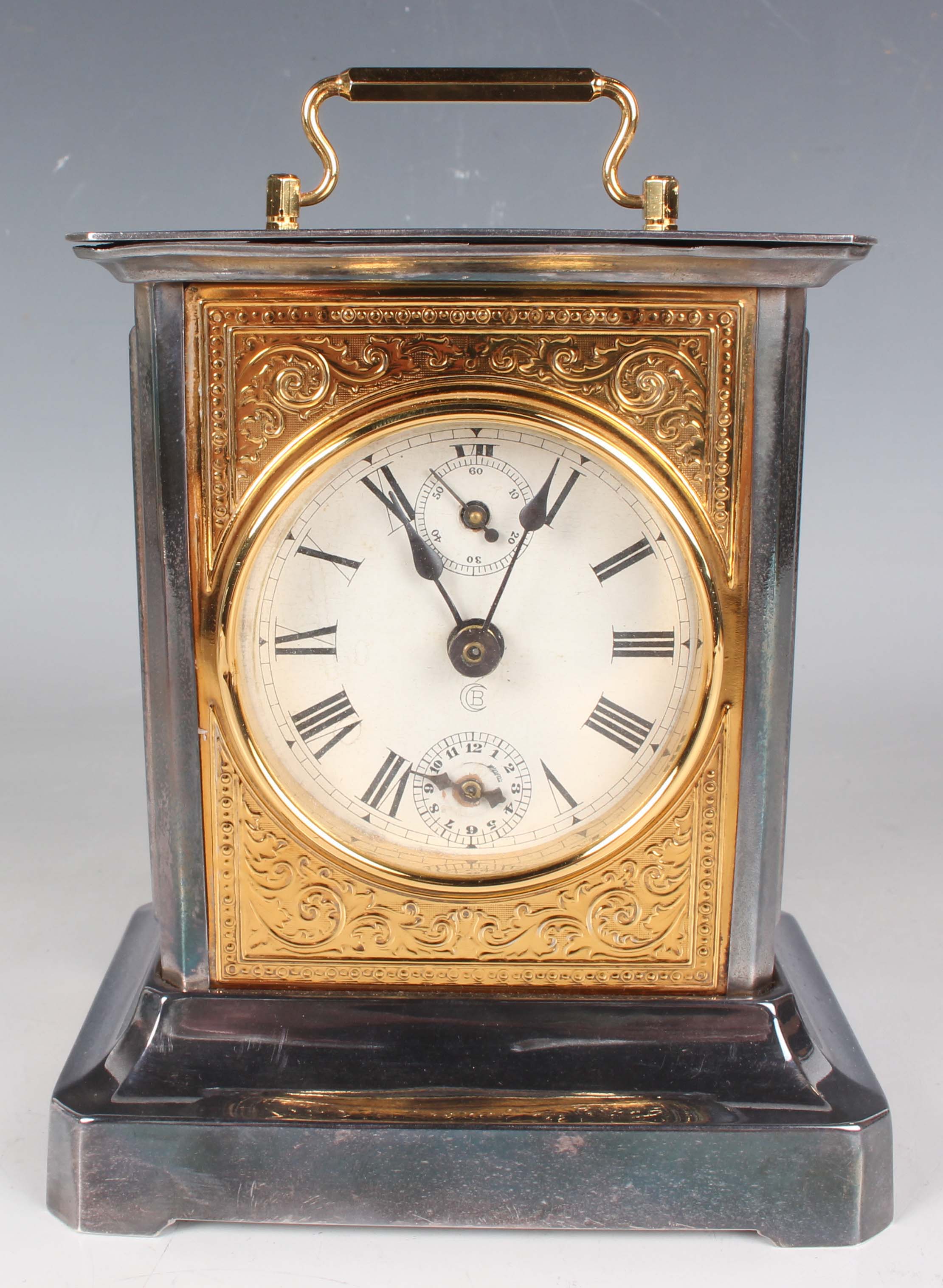 An early 20th century plated and gilt musical carriage alarm clock by Badische Uhrenfabrik, the white circular dial with black Roman hour numerals and subsidiary seconds and alarm dials, the case with swing handle, height 17.5cm.