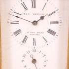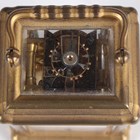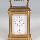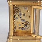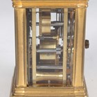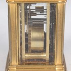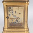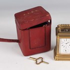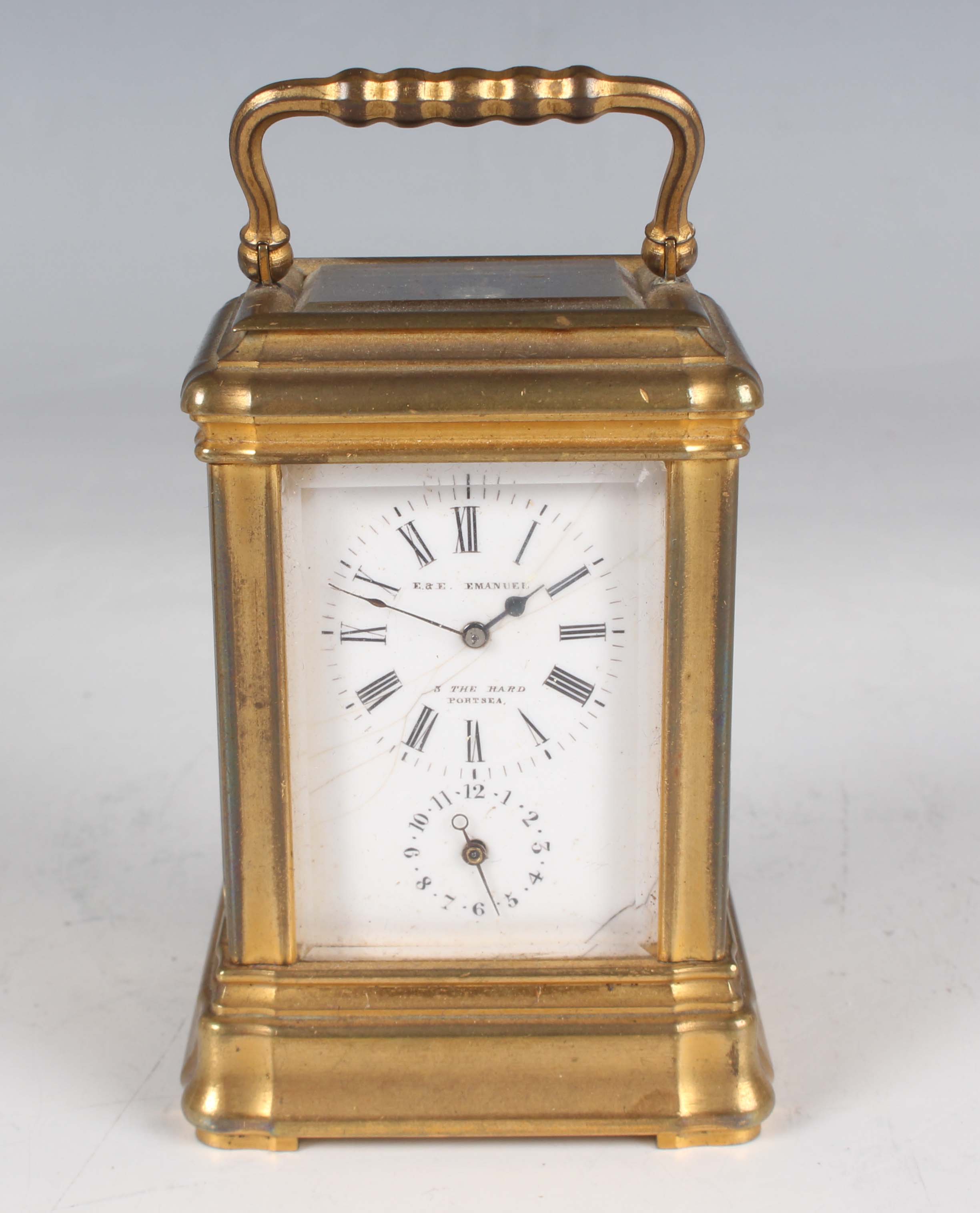 A late 19th/early 20th century French brass gorge cased diminutive carriage alarm clock, the eight day movement striking on a bell, the white enamelled dial with black Roman hour numerals and subsidiary alarm dial and detailed 'E & E Emanuel 3 The Hard Southsea', the gorge case with swing handle and bevelled glass panels, height 9.5cm, with red leather mounted travelling case.