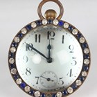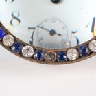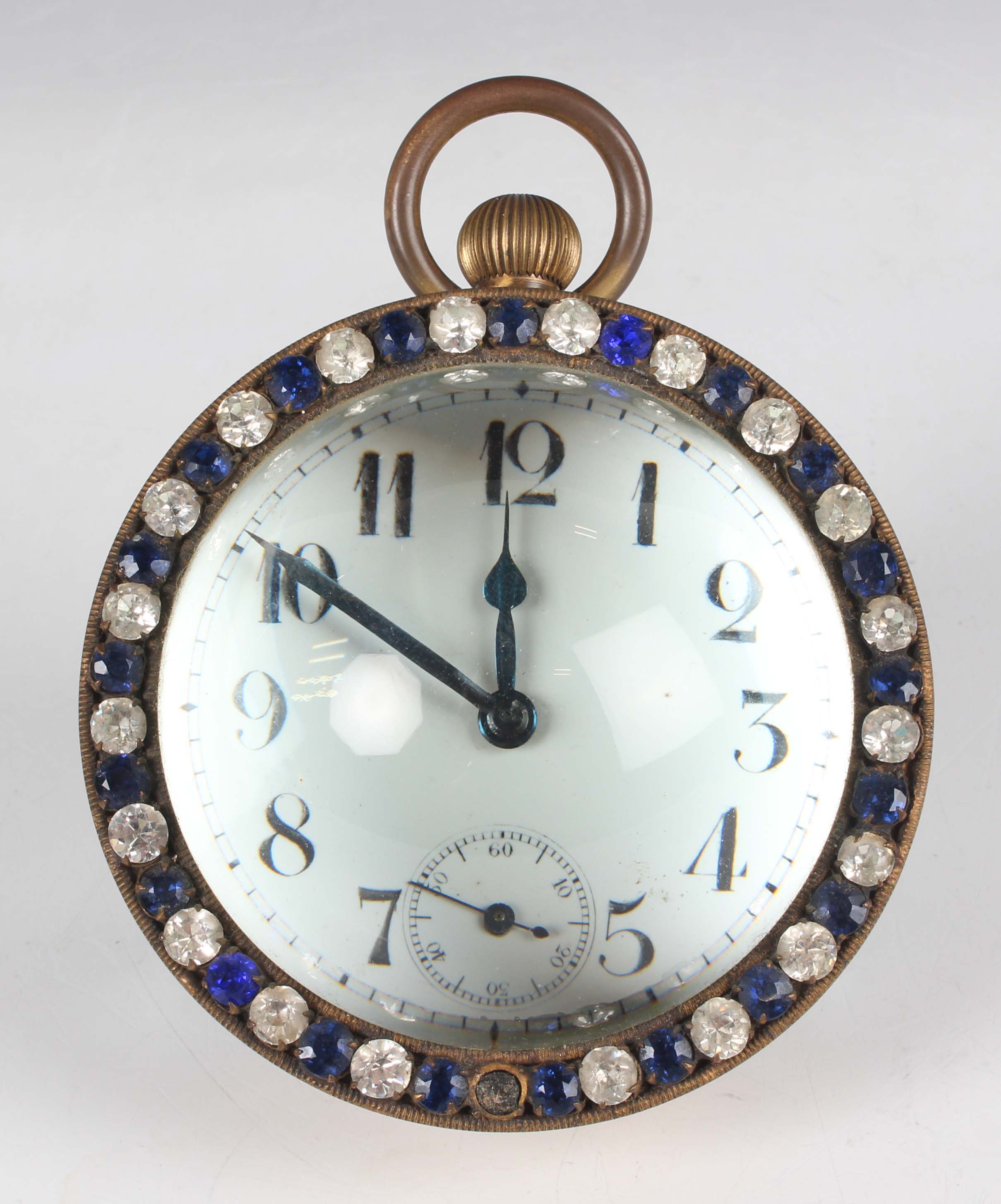 A late 19th/early 20th century keyless wind brass and magnified glass bullseye desk timepiece, the white enamelled dial with Arabic hour numerals and subsidiary seconds, framed by a blue and colourless paste set surround, height 9.5cm (one paste missing).