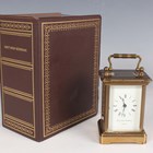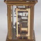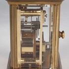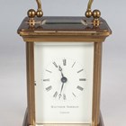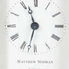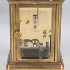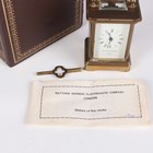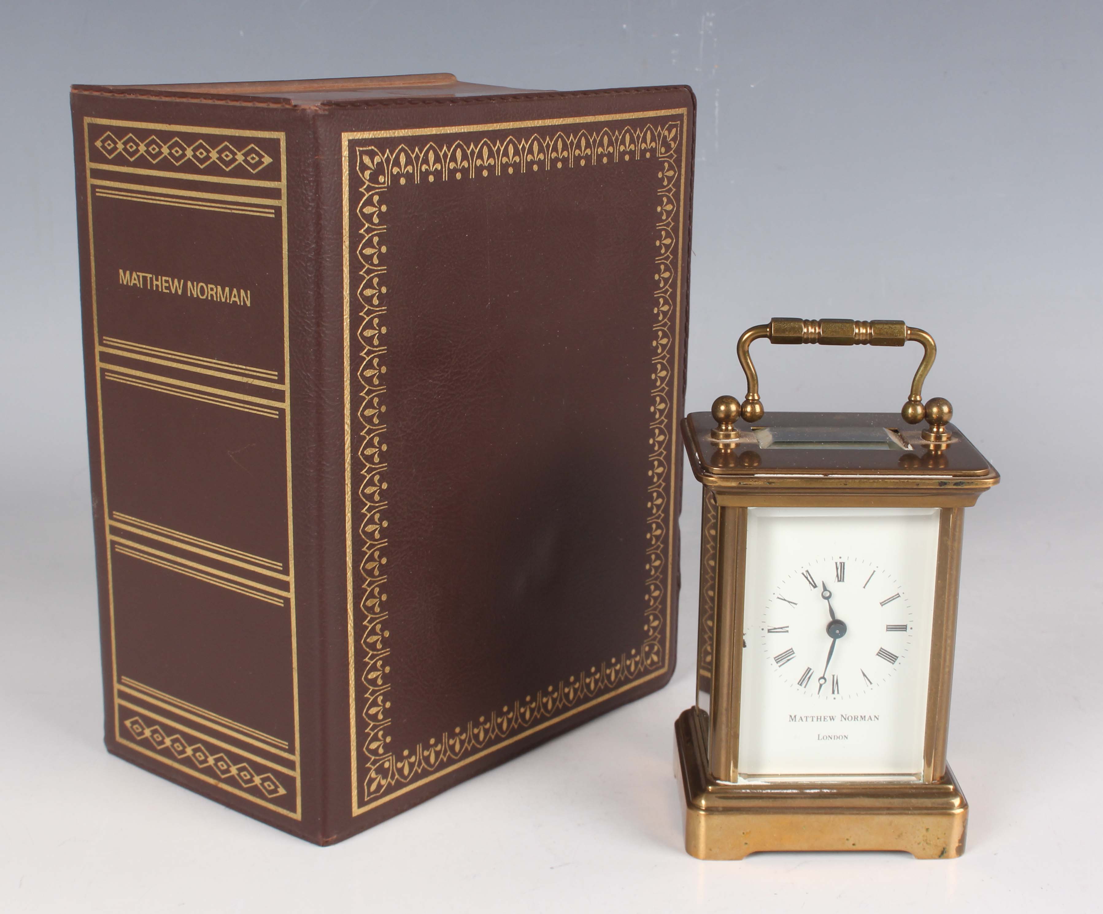 A 20th century brass corniche cased diminutive carriage timepiece, the dial detailed 'Matthew Norman London', the glazed case with swing handle, height 10.2cm, with key, instructions and case.