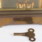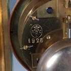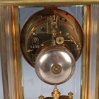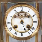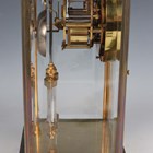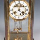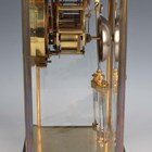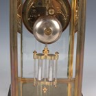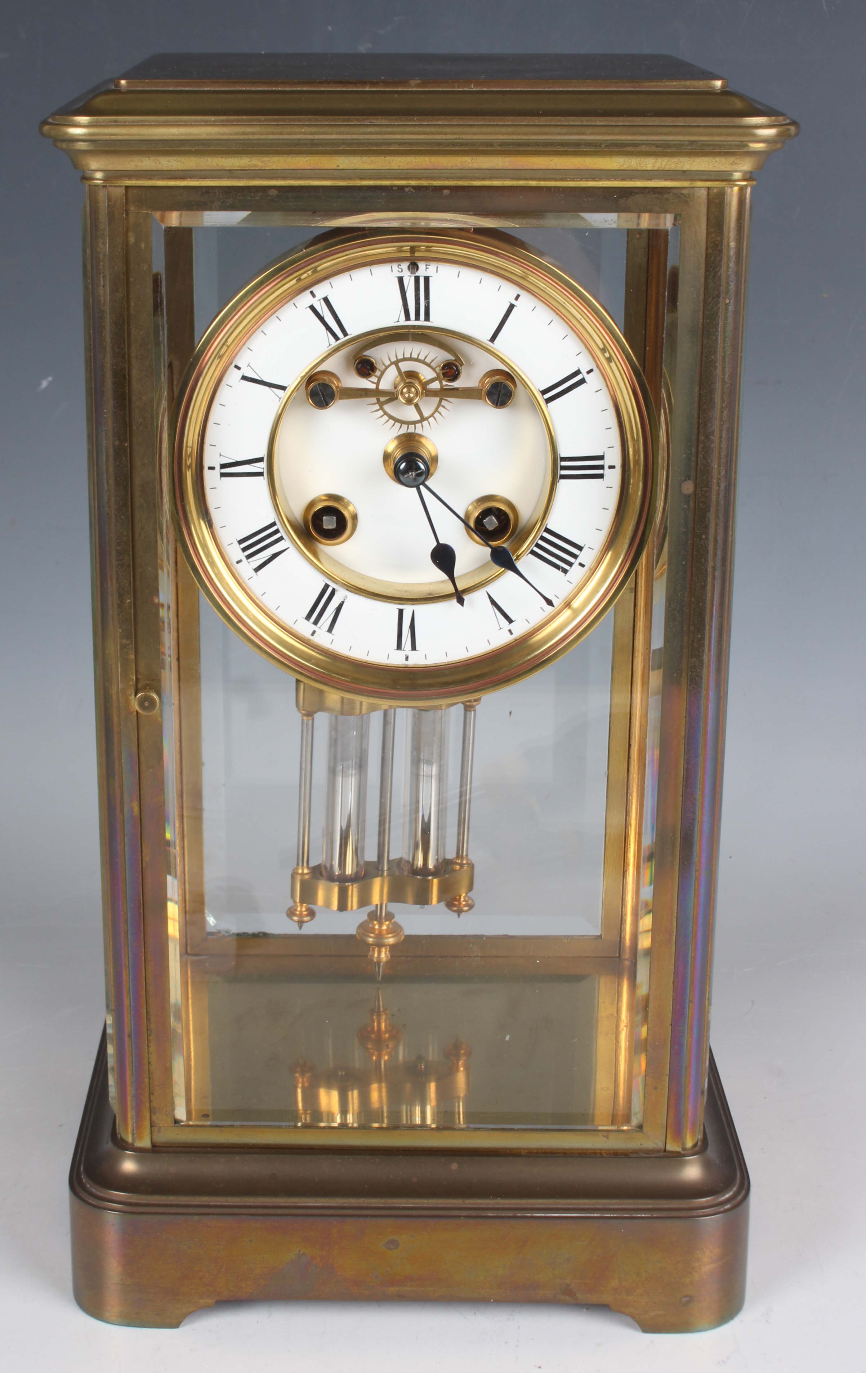 A late 19th/early 20th century French brass cased four glass mantel clock with eight day movement striking on a gong, the backplate with Richard & Cie maker's mark, with mercury compensated pendulum, the two piece white enamelled dial with Brocot escapement and black Roman hour numerals, the case with rounded corners and bevelled glass panels, height 30cm.