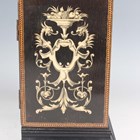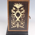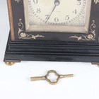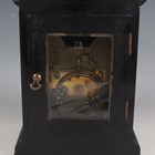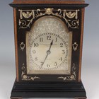 An early 20th century French ebonized and inlaid mantel clock, the eight day movement with platform escapement striking on a gong, the silvered breakarch dial with black Arabic hour numerals, detailed 'Goldsmiths & Silversmiths Company 112 Regent Street London Paris Made', within engraved foliate scroll borders, the rectangular ebonized case with inlaid fruit charged urns, griffons, strapwork and foliate scrolls within boxwood inlaid borders, the moulded rectangular base with brass bun feet, height 23cm.