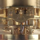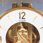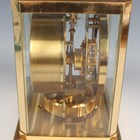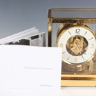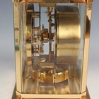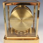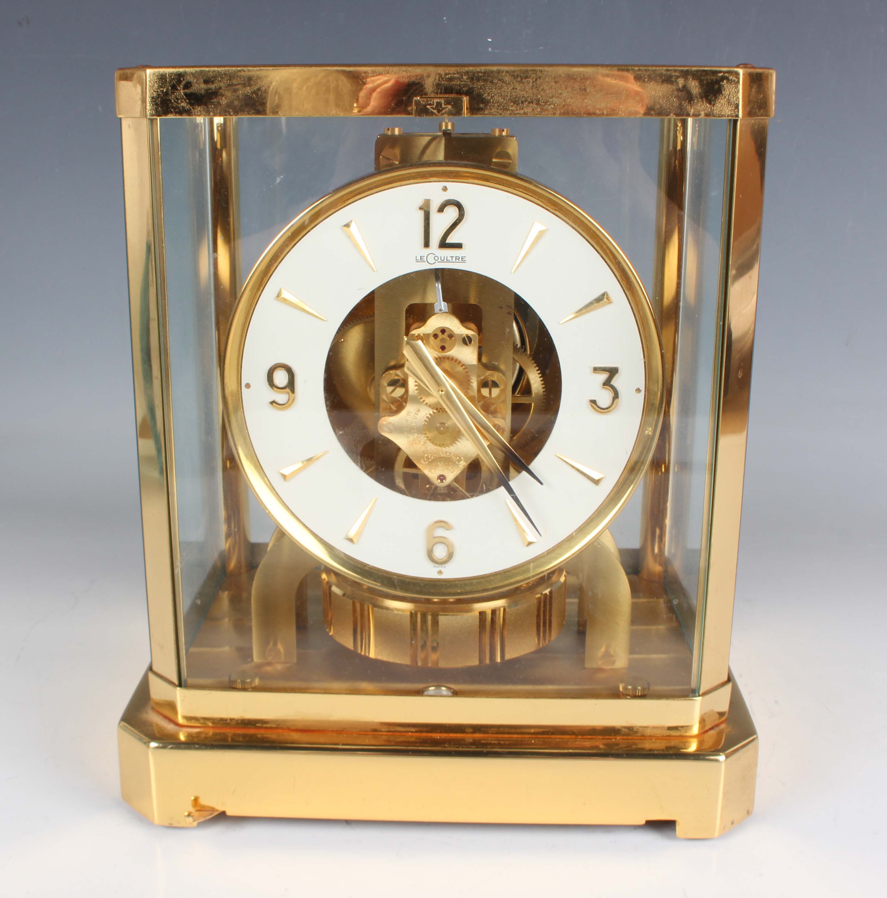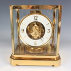 A Jaeger-LeCoultre Atmos mantel timepiece, Ref. 528-8, circa 1970s, the signed perpetual gilt brass movement numbered '369741', the white circular chapter ring with gilt Arabic numeral and arrowhead hour markers, the lacquered brass and glazed case with canted corners, plinth base and bracket feet, height 23.5cm, width 20.8cm, together with a Jaeger-LeCoultre 'The Manufacture's Book of Timepieces' book.