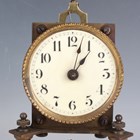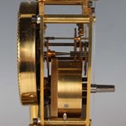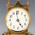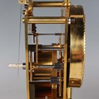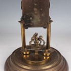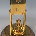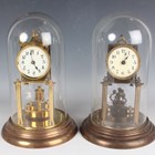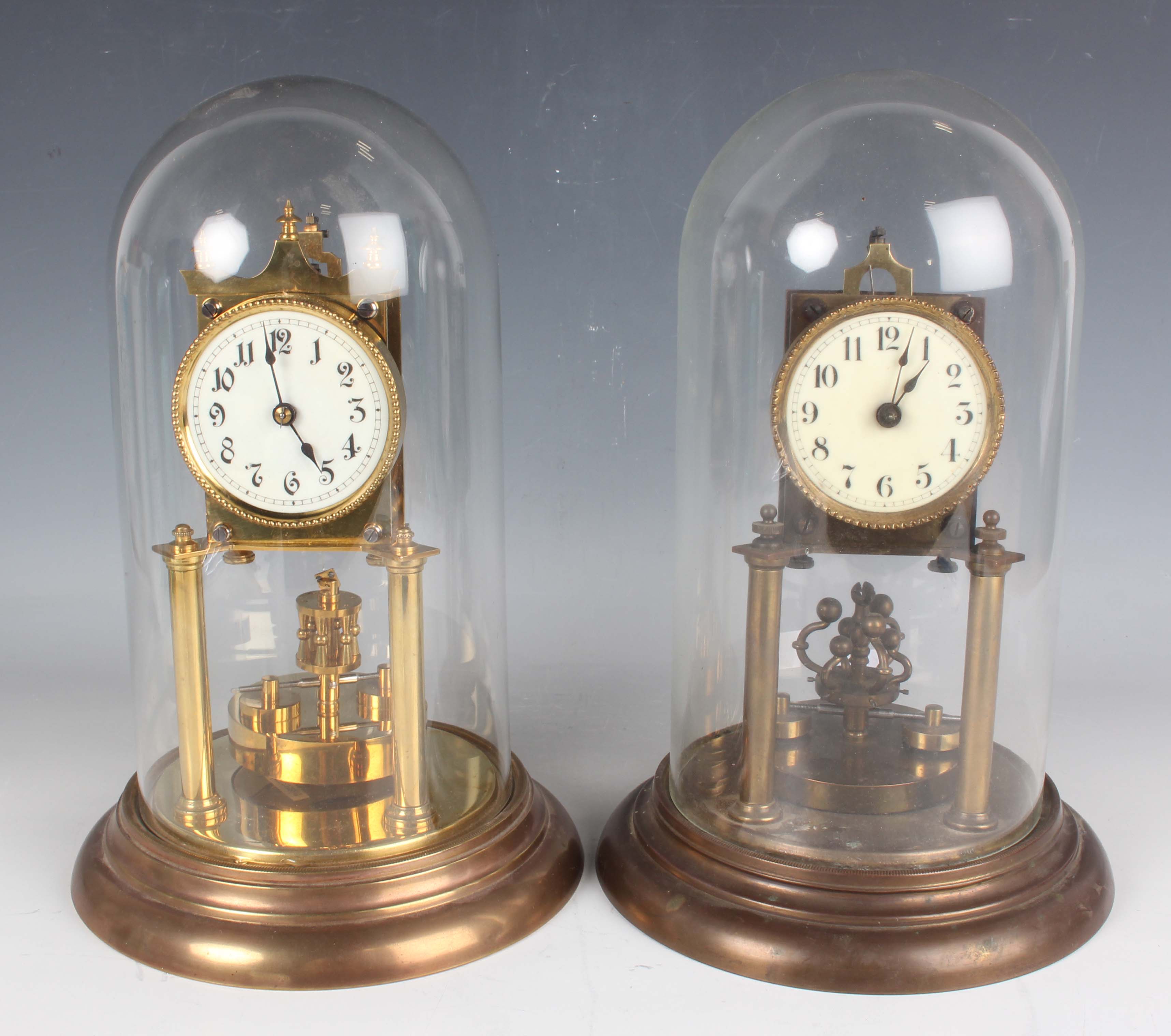 An early 20th century gilt lacquered brass torsion anniversary mantel timepiece, the cream circular dial above turned columns on a circular base with glass dome, total height 29cm, together with a similar anniversary timepiece with glass dome, height 29.5cm.