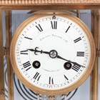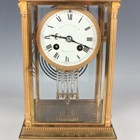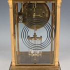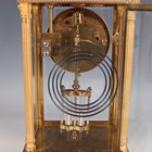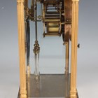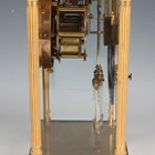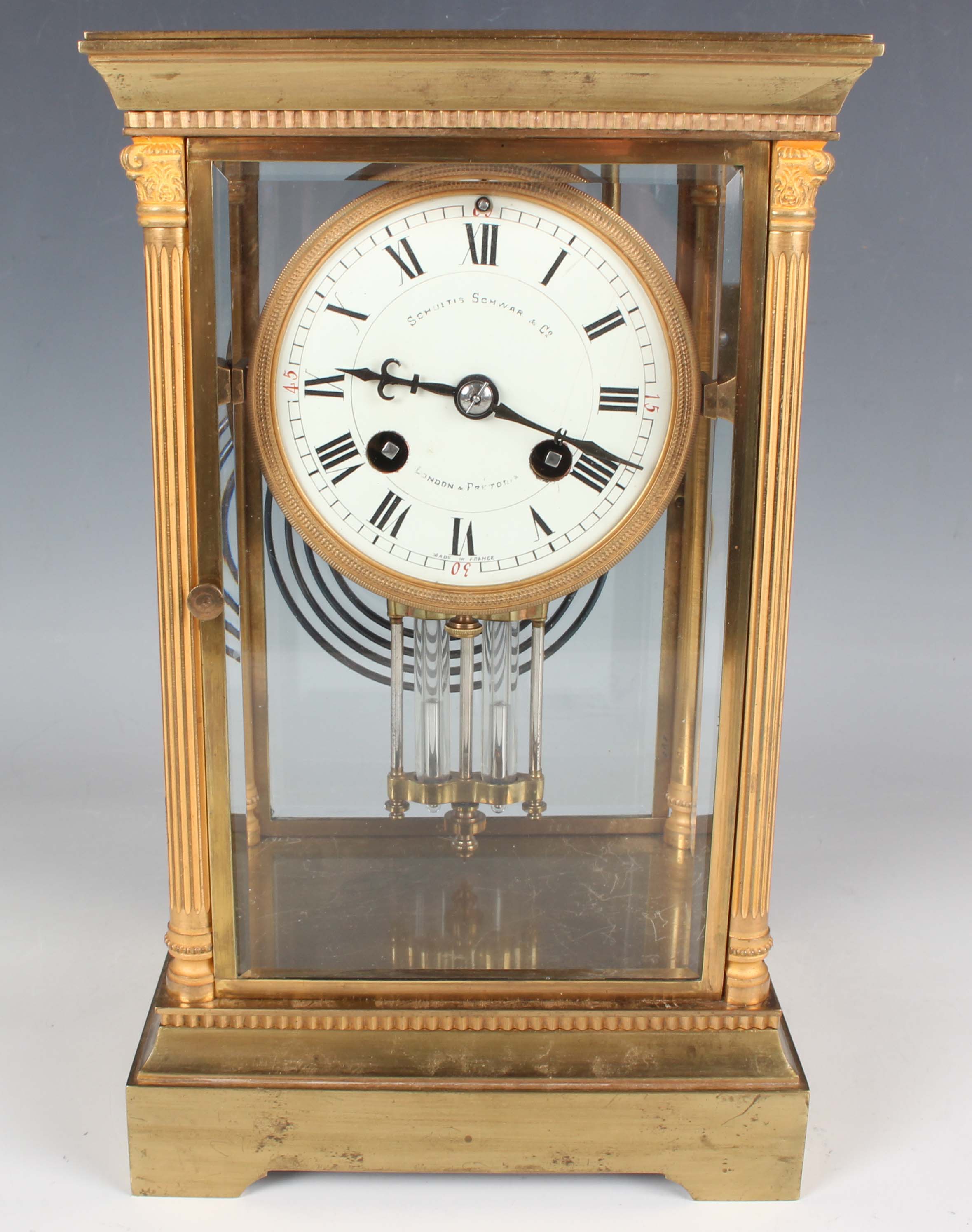 A late 19th/early 20th century French gilt lacquered brass cased four glass mantel clock, the eight day movement striking on a gong with a mercury compensated pendulum, the white enamelled circular dial with black Roman hour numerals and detailed 'Schultis, Schwar & Co London & Pretoria', the rectangular case with Corinthian corner columns and bevelled glass panels, on bracket feet, height 27.8cm.