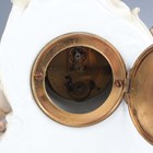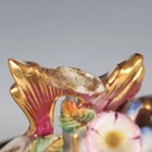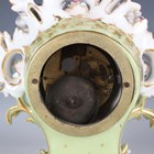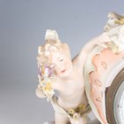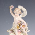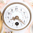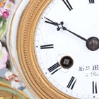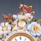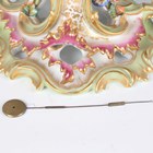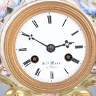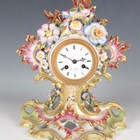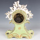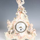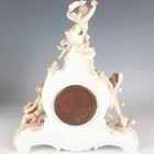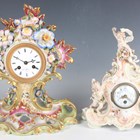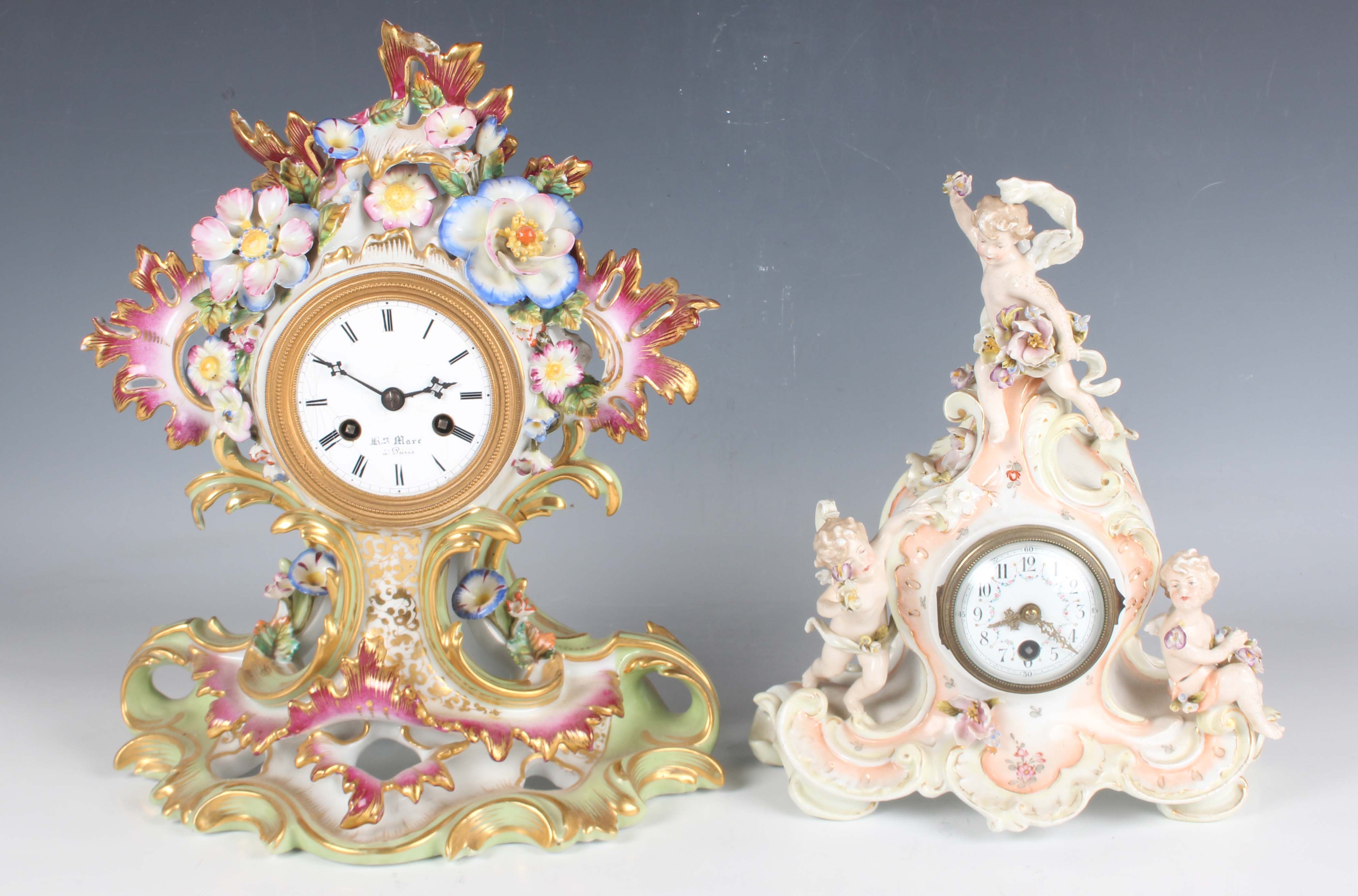 A late 19th century German Volkstedt porcelain clock case, the white enamelled circular dial with black Arabic hour numerals and flower festoons, the rococo scroll moulded case applied with three cherubs, height 24.5cm, together with a 19th century Paris porcelain clock case of flower encrusted rococo scroll form, the white enamelled dial detailed 'Hry Marc a Paris', height 30.5cm, with pendulum (faults).