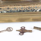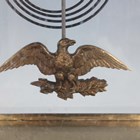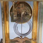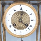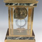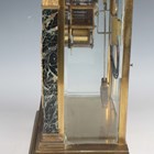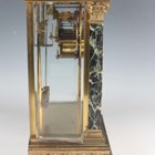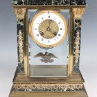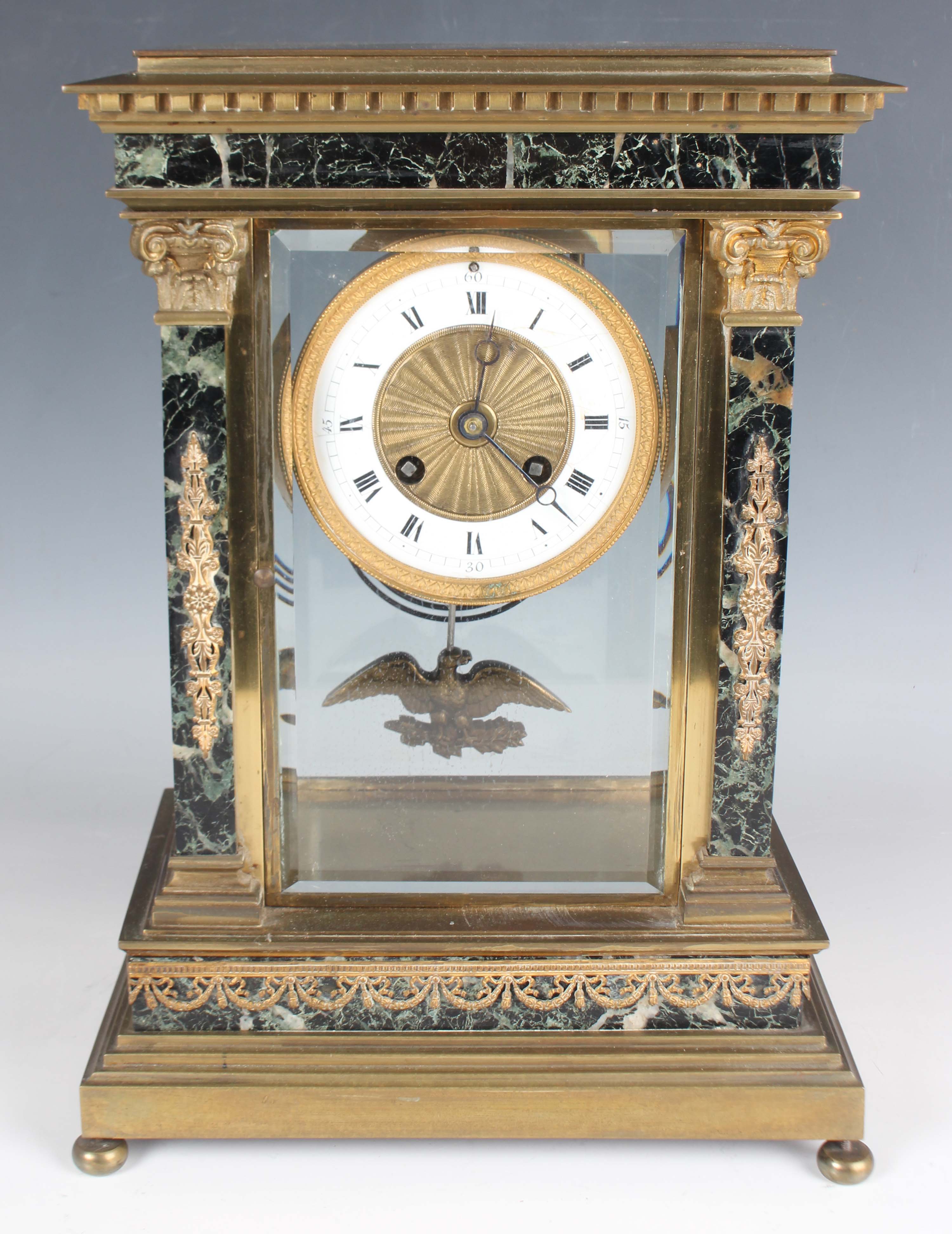 A late 19th/early 20th century brass and green marble four glass mantel clock with eight day movement striking on a gong, the white enamelled chapter ring with black Roman hour numerals framing an engine turned centre, above an imperial eagle pendulum, the case with Ionic columns and bevelled glass panels, on a stepped base and bun feet, height 33.5cm.