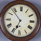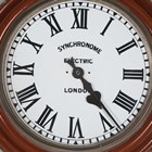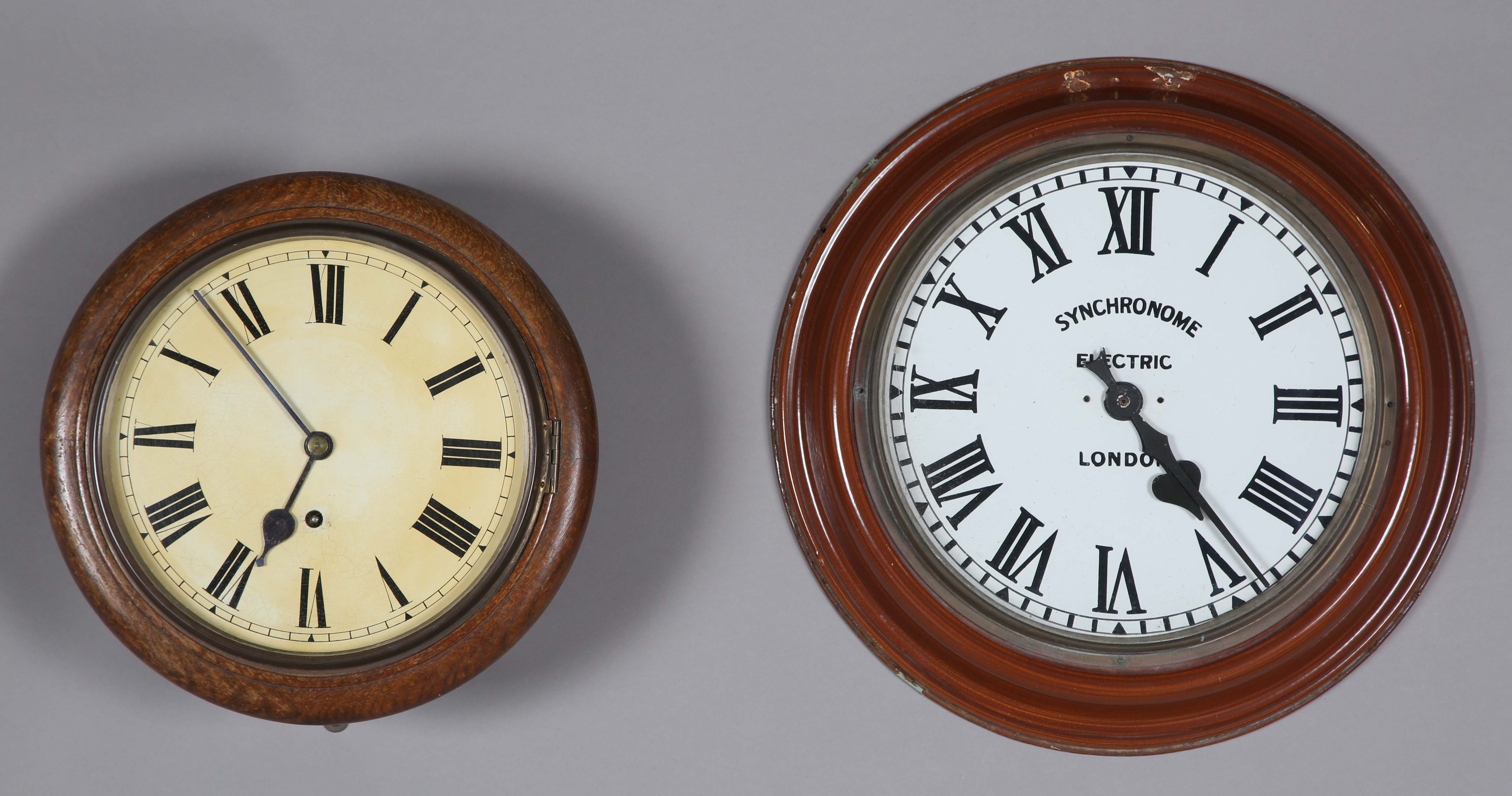 A Synchronome electric wall timepiece, the signed 12-inch circular dial with black Roman hour numerals, within a tole painted simulated walnut surround, case diameter 43cm, together with a beech circular cased wall timepiece, case diameter 32cm, with pendulum.