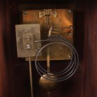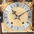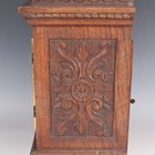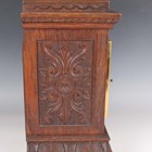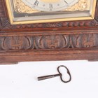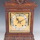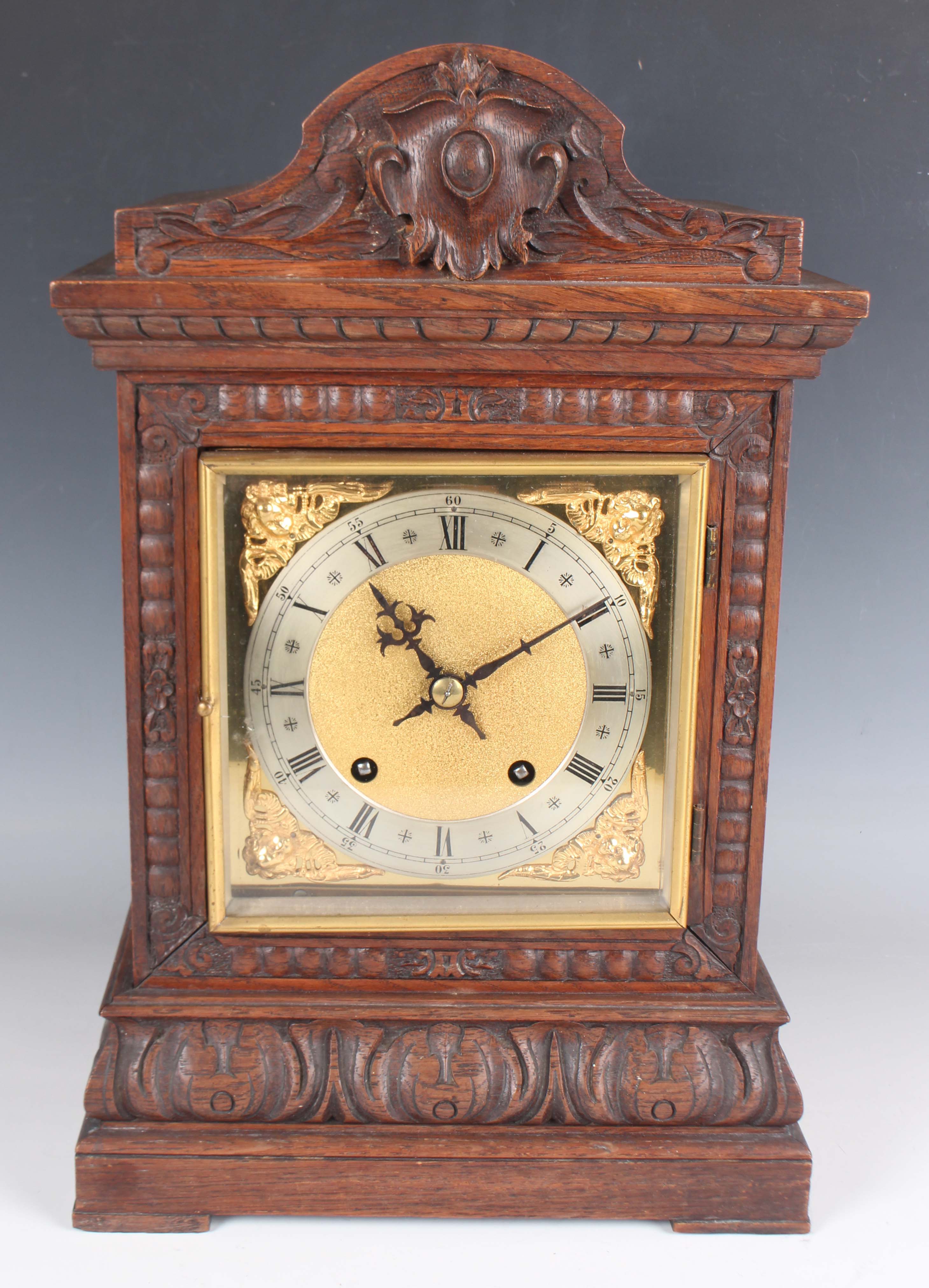 A late 19th century German oak cased bracket clock with eight day movement striking on two gongs, the backplate stamped 'W & H Sch' (Winterhalder & Hofmeier), the square brass dial with matt centre, silvered chapter ring and gilt cherub spandrels, the case with carved decoration, height 42.5cm, with pendulum.
