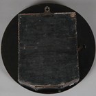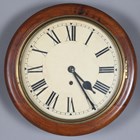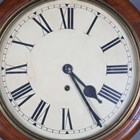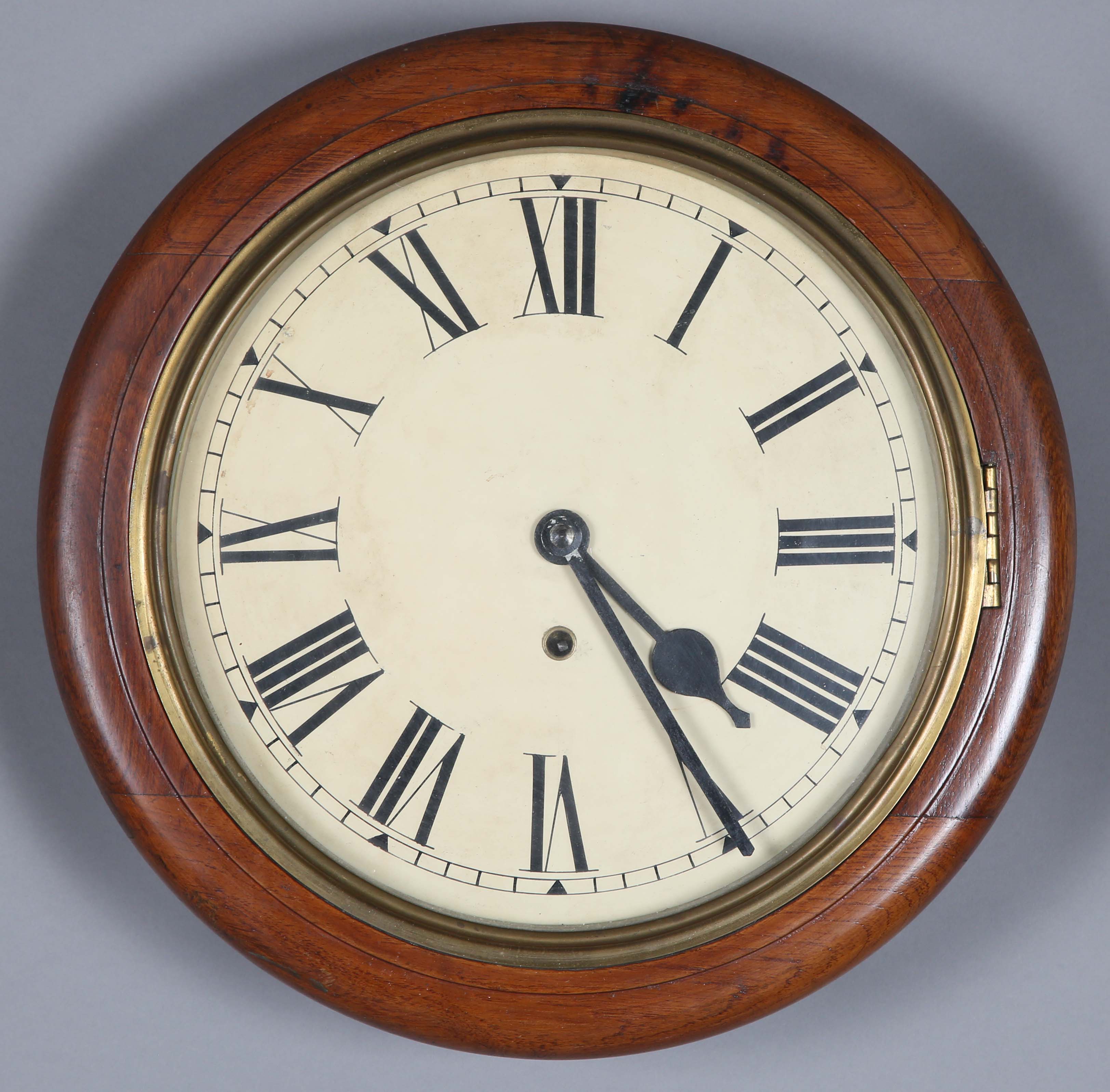 A George V walnut circular cased wall timepiece, the 12-inch dial with black Roman hour numerals, within a moulded surround, case diameter 39cm, with pendulum and winding key.