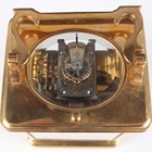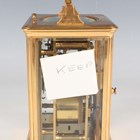 A late 19th century French lacquered brass corniche cased carriage clock with eight day movement striking and repeating on a gong, the cream chapter ring with black Arabic hour numerals within a gilt surround, the case with swing handle and bevelled glass panels, height 17.9cm.